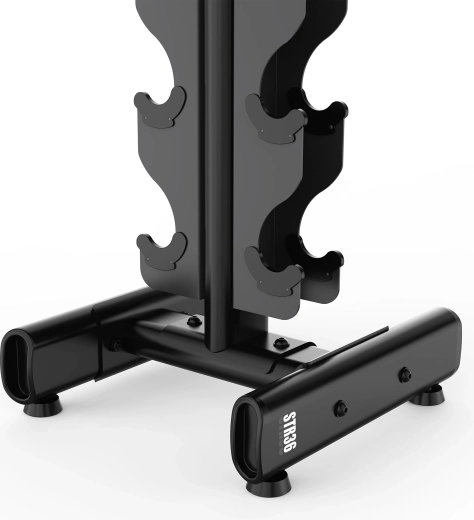 Solidna stalowa konstrukcja oraz szeroka, stabilna podstawa gwarantują długą żywotność i bezpieczne odkładanie hantli. Antypoślizgowe końcówki chronią podłogę i zapobiegają przesuwaniu się stojaka podczas manipulacji hantlami.