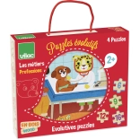Zestaw zawiera cztery puzzle progresywne z motywami różnych zawodów, zaprojektowane tak, aby motywować dzieci do stopniowej poprawy umiejętności. Dzięki różnej liczbie elementów małe rączki opanują właściwe techniki układania i nauczą się rozpoznawać kształty oraz kolory.