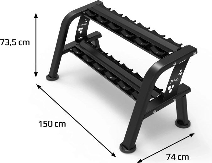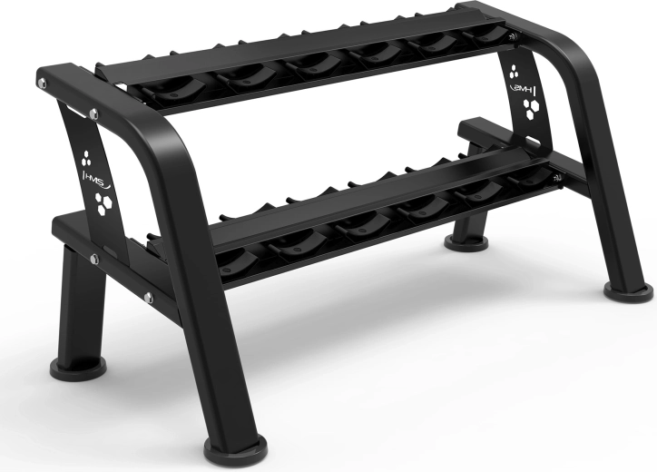 HMS STR48 to przemyślanie zaprojektowany, dwupoziomowy stojak zapewniający bezpieczne przechowywanie do 12 hantli. Dzięki lekko pochylonym półkom manipulacja hantlami jest wygodniejsza i mniej obciąża nadgarstki. Ciężka stalowa konstrukcja i szeroka podstawa gwarantują wysoką stabilność nawet przy pełnym obciążeniu.