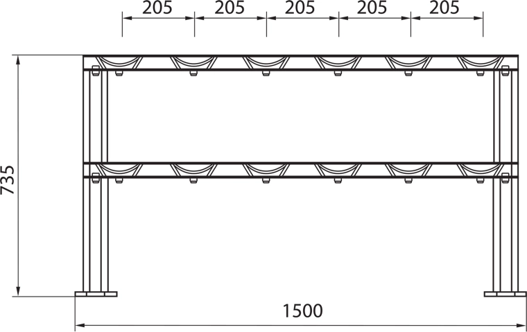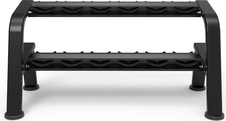 Dwie szerokie, lekko pochylone półki zapewniają szybki i bezpieczny dostęp do sześciu par hantli i oszczędzają miejsce w Twojej siłowni.