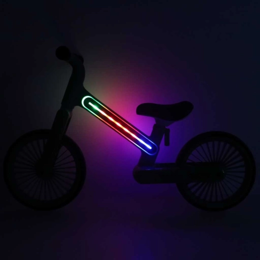Wybierz styl oświetlenia od delikatnych pulsów po tęczowe przejścia. Jeden przycisk pod ramą włącza światła i przełącza efekty – dziecko jest lepiej widoczne i czerpie większą radość z jazdy.