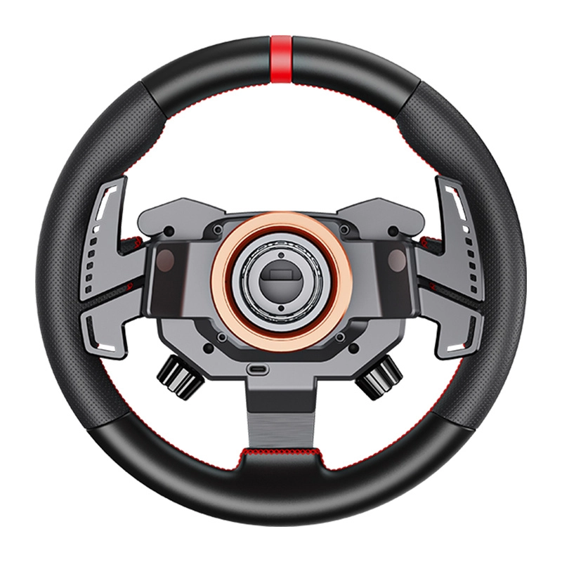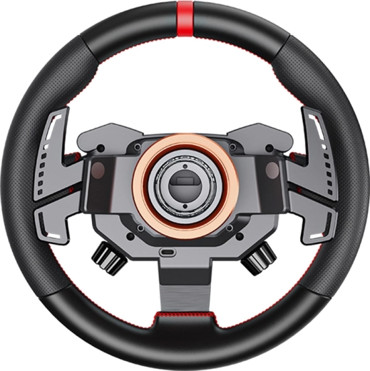 Szerokie możliwości mapowania obejmują 12 przycisków i 2 pokrętła-enkodery, więc kluczowe funkcje masz zawsze pod ręką. Wieniec pokryty w pełni tkaną mikrofibrową skórą jest przyjemny w dotyku, nie ślizga się i redukuje zmęczenie dłoni nawet podczas długich sesji. Komunikacja przez pierścieniowy kolektor zapewnia stabilne przesyłanie bez przerw.