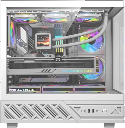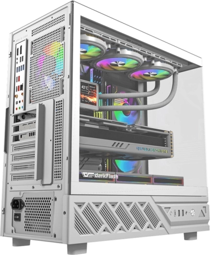 DarkFlash DS950 to stylowa obudowa midi tower do wydajnych zestawów gamingowych i roboczych. Dwa duże, przezroczyste panele z hartowanego szkła bez pionowego profilu zapewniają czysty widok 270° na komponenty i elementy RGB. Solidna konstrukcja z 0,5 mm SPCC gwarantuje stabilność i długą żywotność, a gęste siatki i filtracja chronią przed kurzem i wspierają płynny przepływ powietrza.