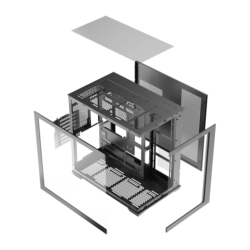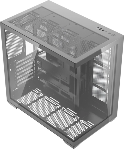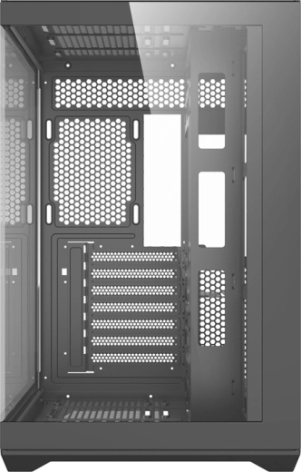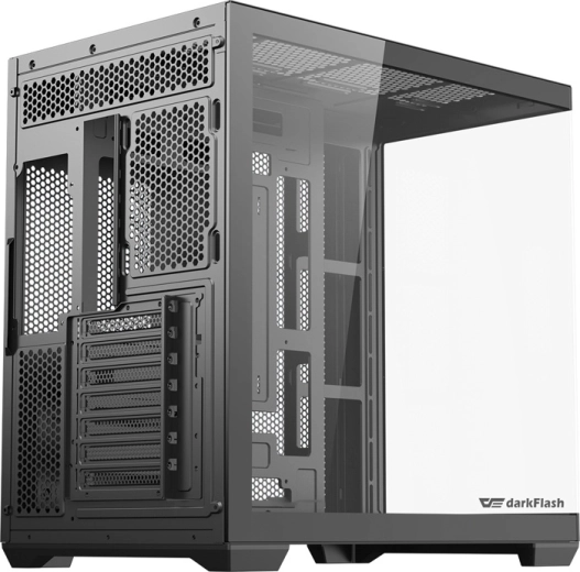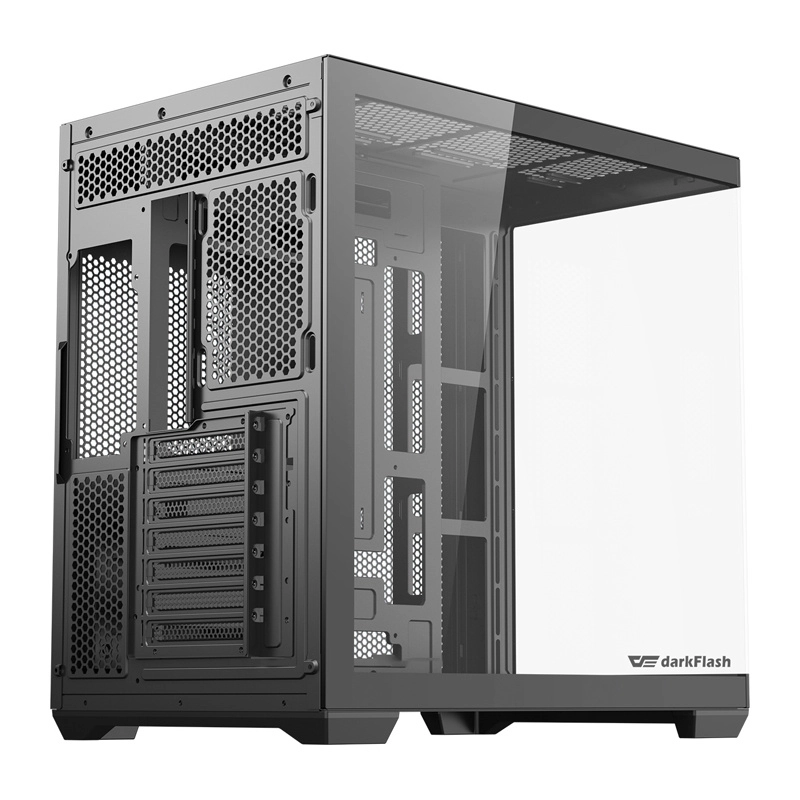 DarkFlash C280 wynosi prezentację podzespołów na nowy poziom dzięki bezramkowemu panoramicznemu wykonaniu 270°. Dwa boczne panele z hartowanego szkła podkreślają podświetlenie RGB, pętle chłodzenia wodnego oraz uporządkowane prowadzenie kabli. Przestronne wnętrze mieści wydajne konfiguracje i umożliwia poziomy oraz pionowy montaż GPU.