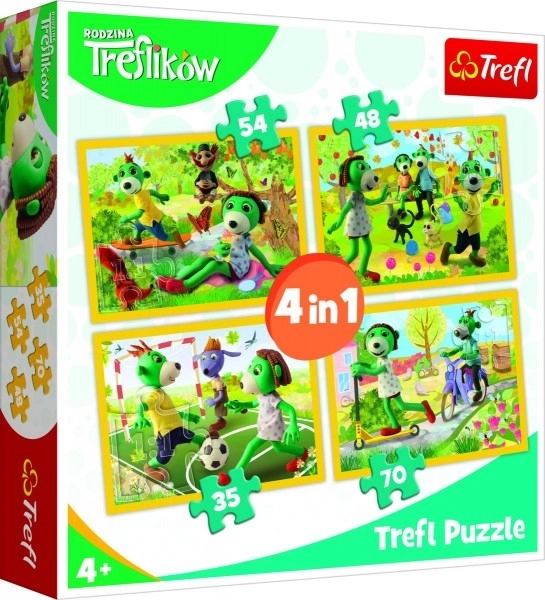 Spraw radość dzieciom kolorowym zestawem 4 niezależnych puzzli z motywami ulubionego serialu Rodzina Treflików. Każdy obrazek ma inną liczbę elementów, dzięki czemu zadowoli zarówno początkujących, jak i nieco bardziej zaawansowanych miłośników układanek. Dzięki specjalnemu papierowi, który odbiją światło, elementy lepiej się wyróżniają, a układanie jest przyjemniejsze.