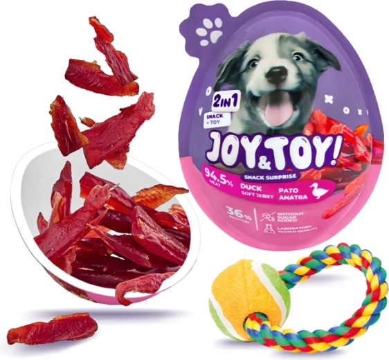 Odkryj zabawę i nagrodę w jednym: jajko Joy&Toy skrywa miękkie kacze jerky oraz zabawkę-niespodziankę dla Twojego psa. Przekąska zawiera 94,5% piersi z kaczki, suszona delikatnym procesem, bez barwników, cukru i polepszaczy smaku. W każdym opakowaniu inny model zabawki – ponad 100 możliwości dla aktywnej zabawy i radości.