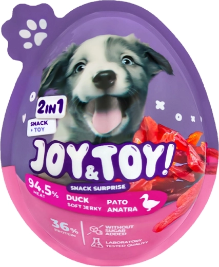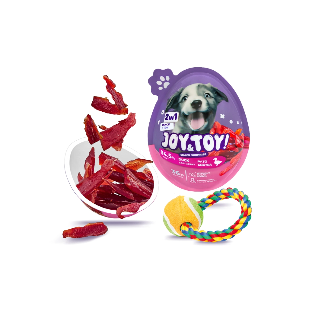 Jajko Joy&Toy daje podwójną radość: premium mięsny przysmak i wysokiej jakości zabawkę dla psów (niektóre warianty ucieszą też koty). Miękkie kacze jerky z wysoką zawartością mięsa oferuje naturalny smak i aromat, jest bogate w białko i wytwarzane w procesie starannie kontrolowanego suszenia. Każde jajko kryje inną zabawkę – od dentystycznych, przez gumowe, po pluszowe – do zabawy, treningu i relaksu.