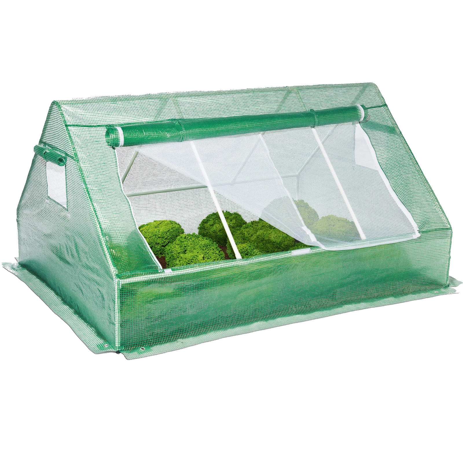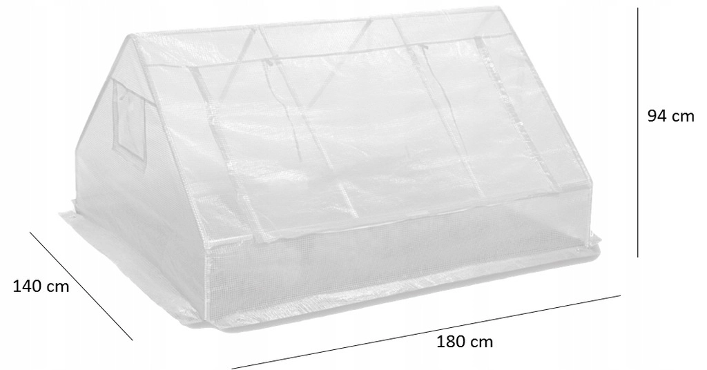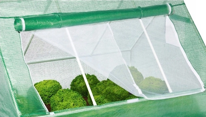 Wzmocniona powłoka PE 130 g/m² z wbudowaną siatką przepuszcza światło, utrzymuje ciepło i ma roletowe okno do regulacji przepływu powietrza i wilgotności.