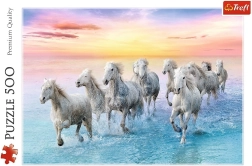 Puzzle zawierające 500 elementów, które ukazują piękno i elegancję białych koni w pełnym biegu. Po złożeniu tego puzzla uzyskasz obraz o wymiarach 48x34 cm.