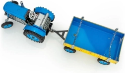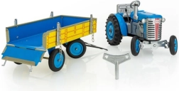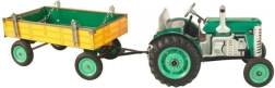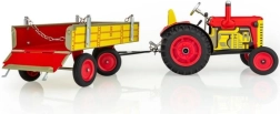 Klasyczna blaszana zabawka dla małych i dużych fanów techniki rolniczej: traktor Zetor z odczepianą przyczepą na sprężynowy mechanizm na kluczyk. Oferuje 3 biegi (do przodu, neutralny, wsteczny), działające sterowanie kierownicą oraz hamulec ręczny. Precyzyjne czeskie rzemiosło, certyfikat Bezpiecznej Zabawki i wytrzymała konstrukcja z nadrukowanej blachy uzupełniona plastikowymi kołami.
