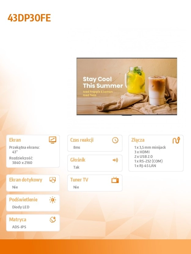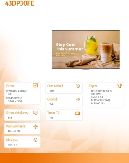 Profesjonalny wyświetlacz do cyfrowego signage o przekątnej 43", rozdzielczości 4K UHD i panelu ADS zapewniającym wierne kolory oraz szerokie kąty widzenia. Idealny do sklepów, recepcji i przestrzeni biurowych z trybem pracy 16/7. Oferuje wysoką szczegółowość obrazu, niezawodną, ciągłą pracę oraz nowoczesny, smukły design dla estetycznej instalacji.