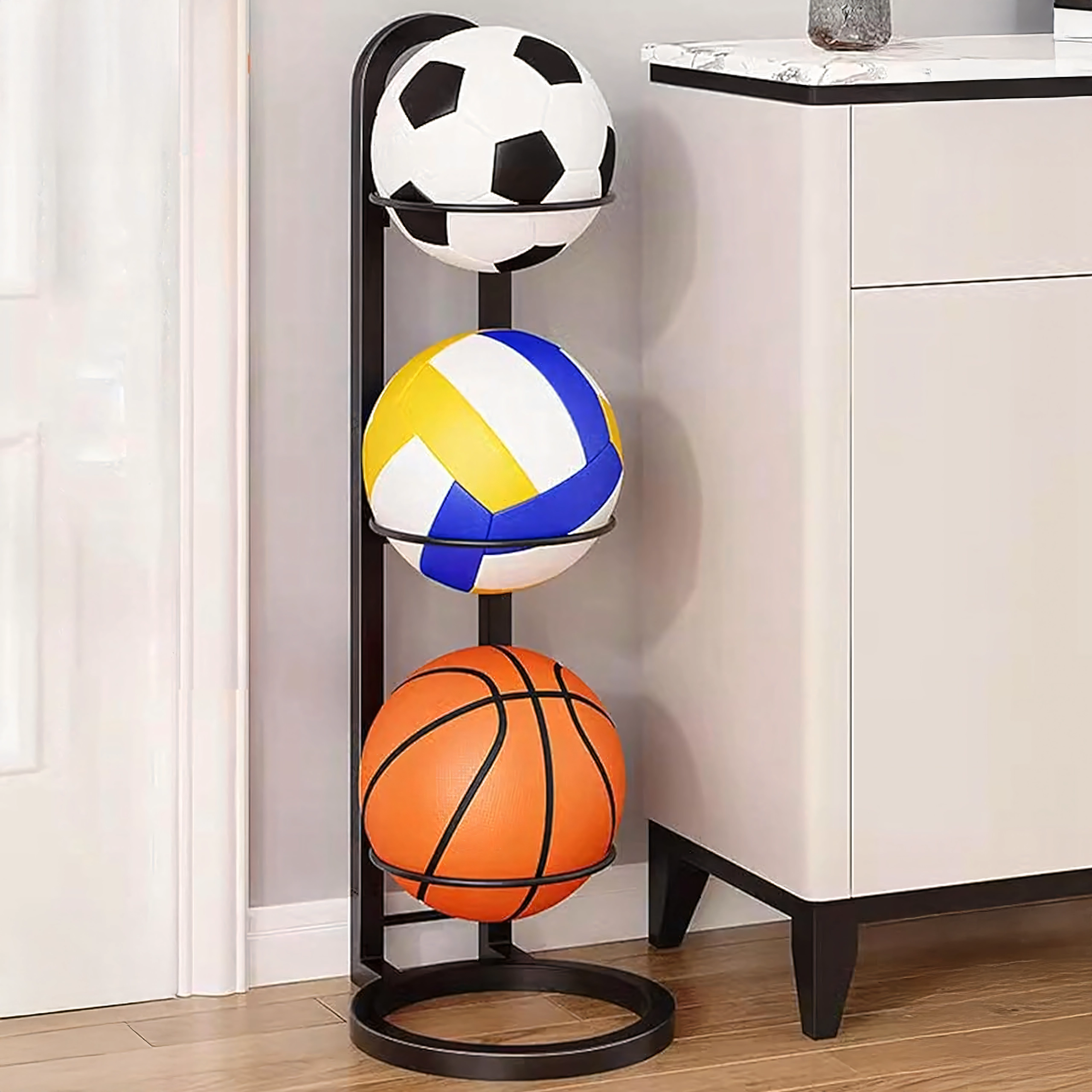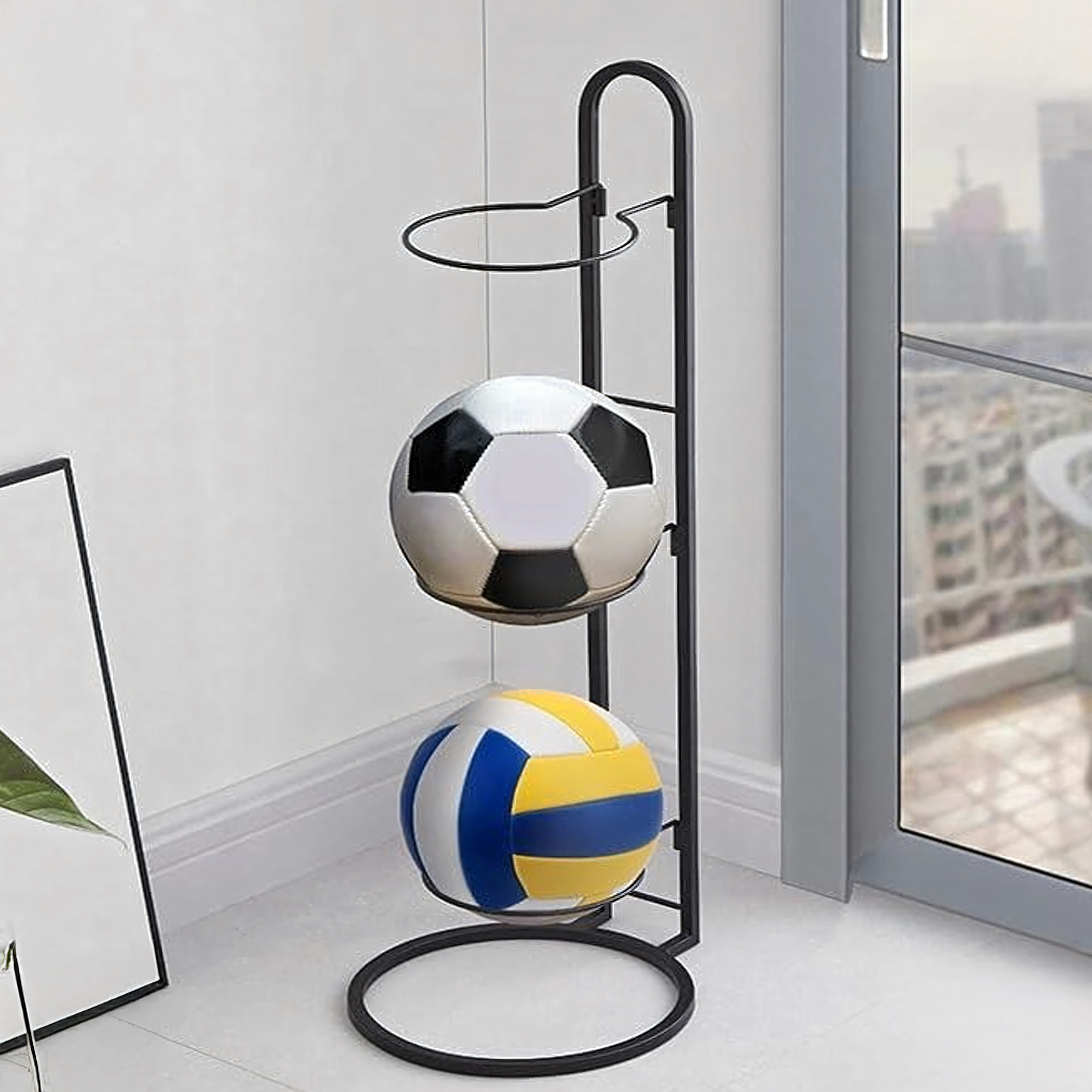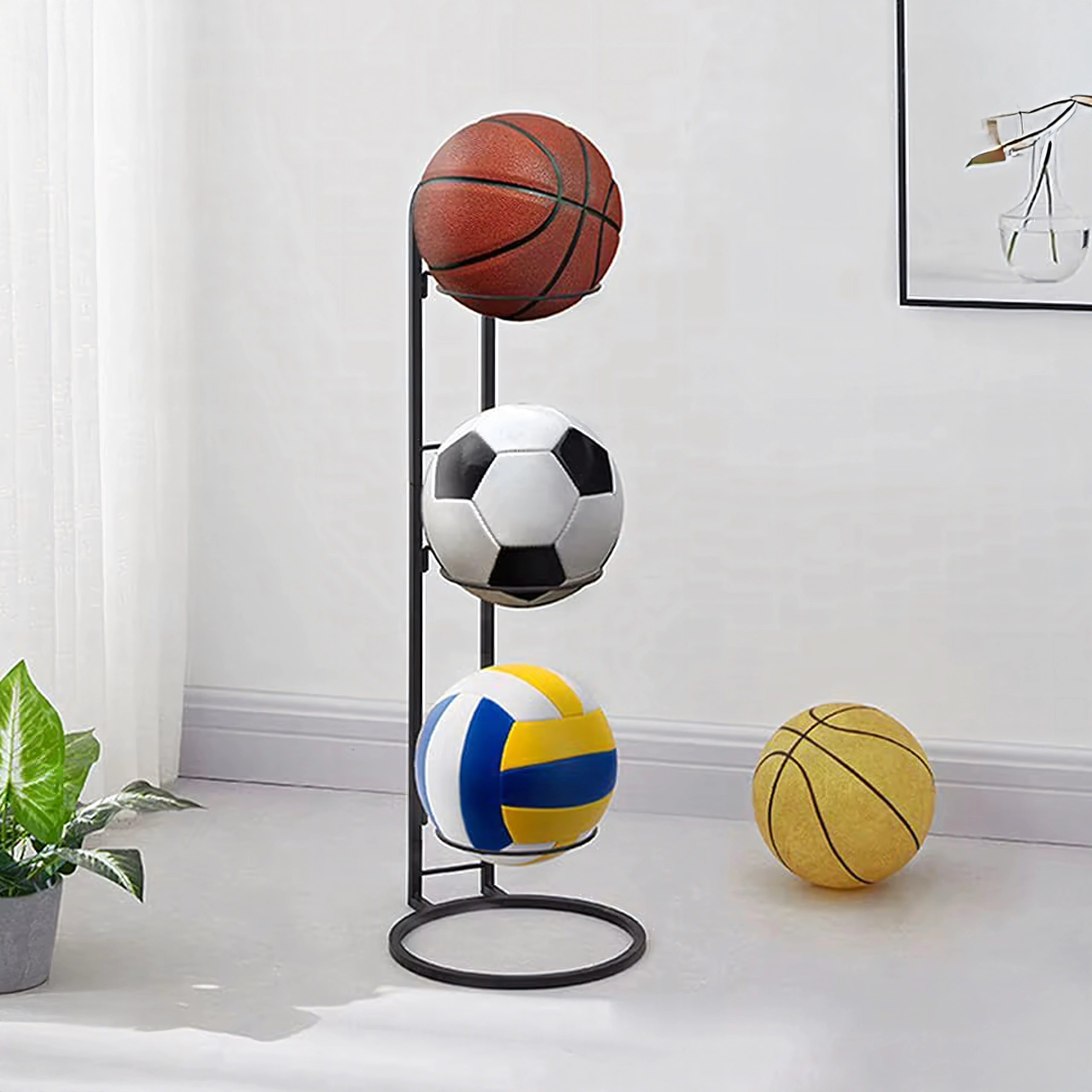 Minimalistyczny design w czarnym kolorze z łatwością wpasuje się w nowoczesne wnętrza. Stojak pasuje do standardowych rozmiarów piłek sportowych (koszykówka, piłka nożna, siatkówka) i umożliwia szybkie odkładanie oraz wyjmowanie jedną ręką.