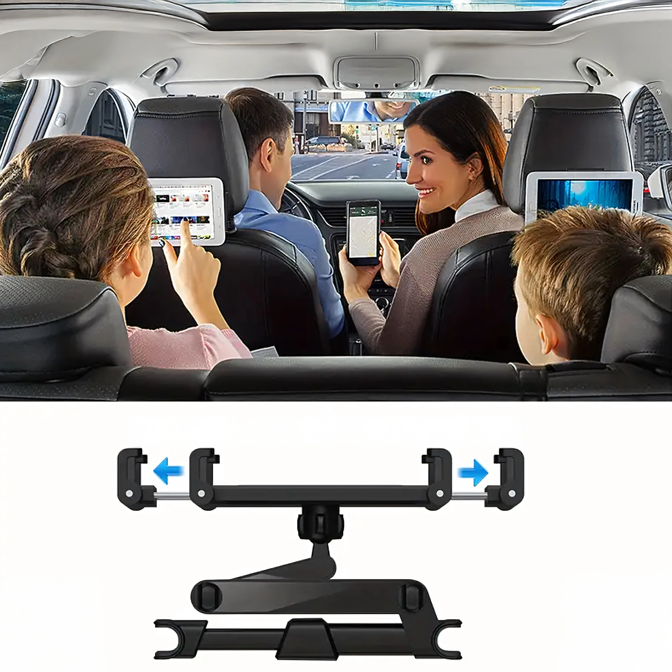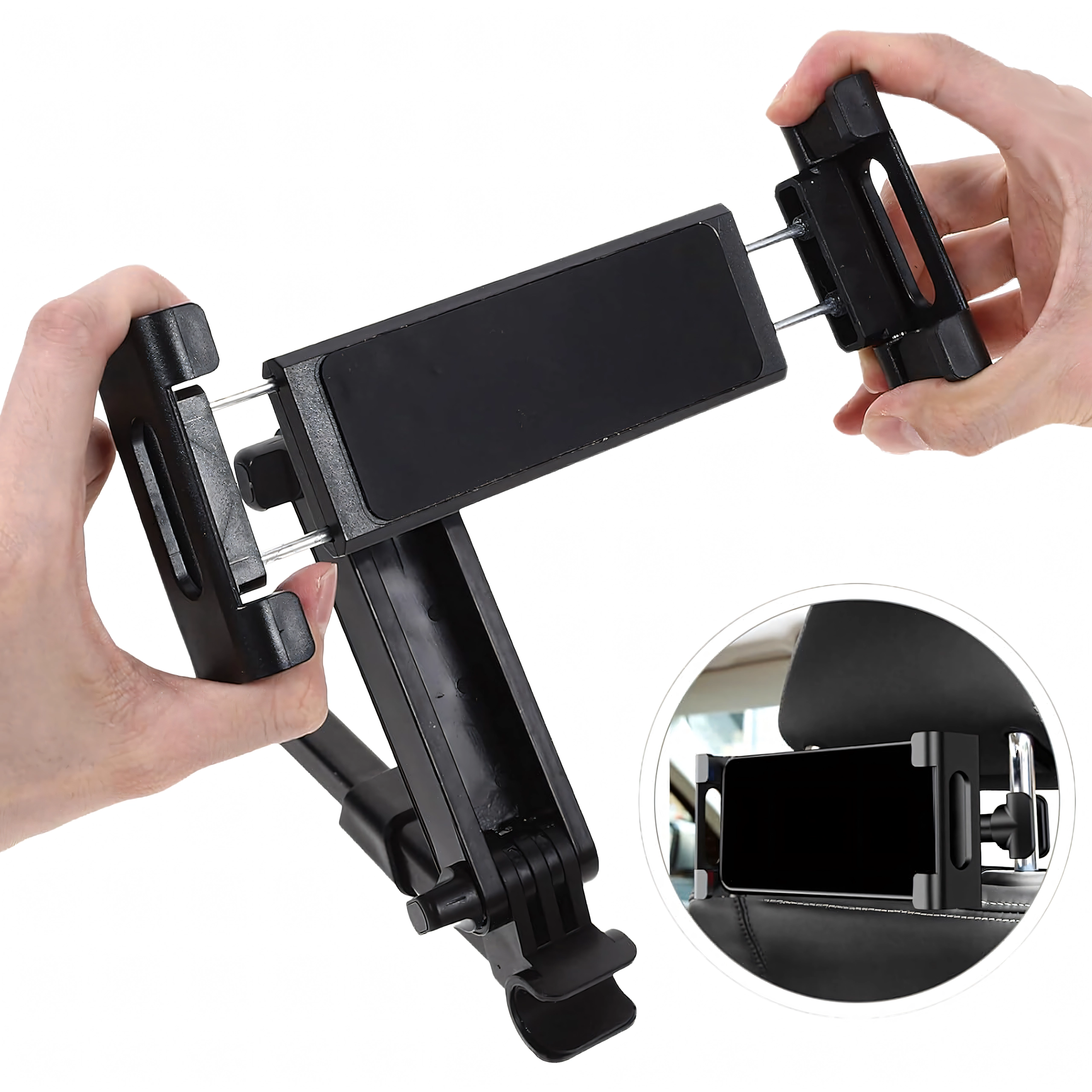 Ciesz się spokojną jazdą i rozrywką dla pasażerów. Solidny uchwyt mocuje się między prętami zagłówka, a dzięki regulowanym ramionom bezpiecznie mieści większość telefonów i tabletów. Miękkie wkładki chronią urządzenia przed zarysowaniami, a śruby blokujące utrzymują stabilną pozycję nawet na nierównościach.