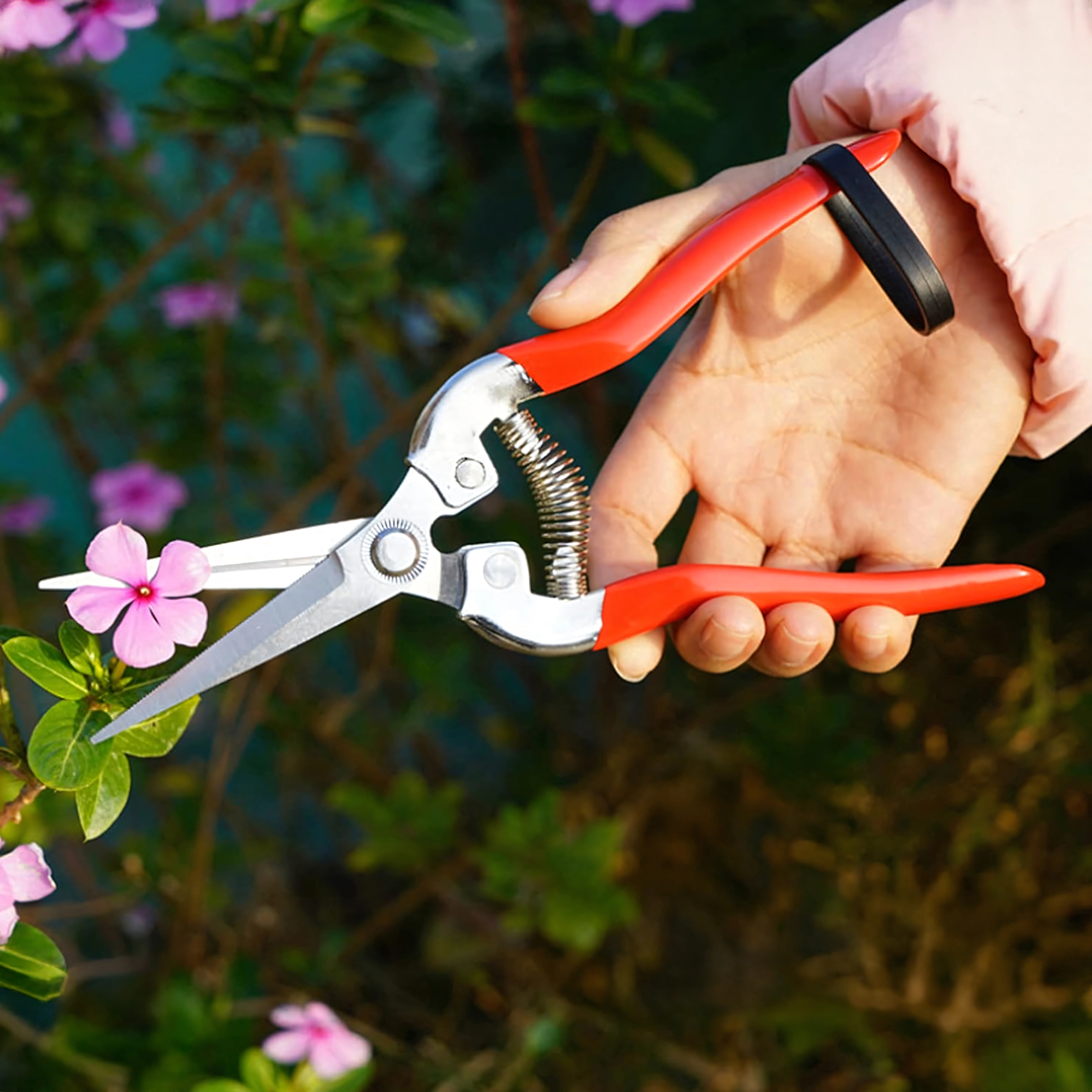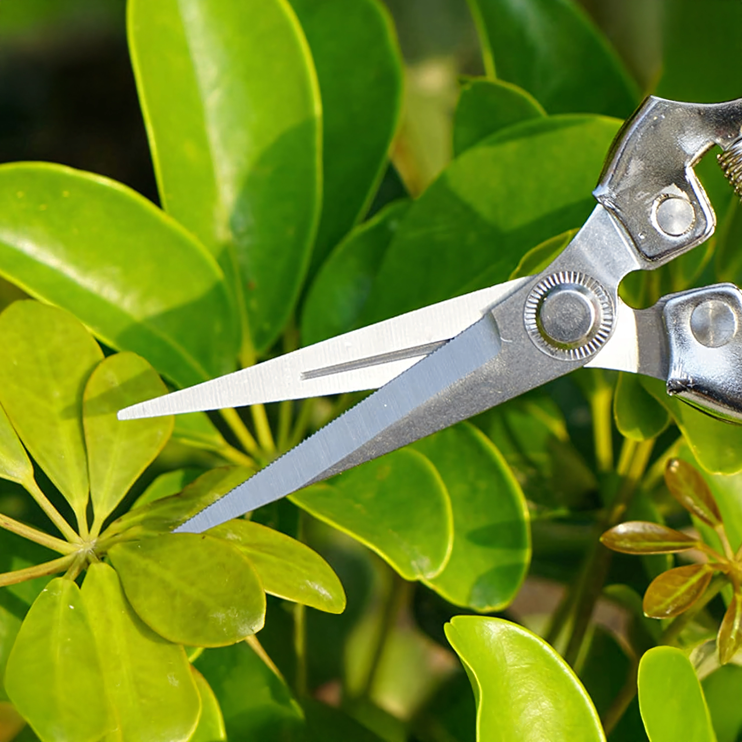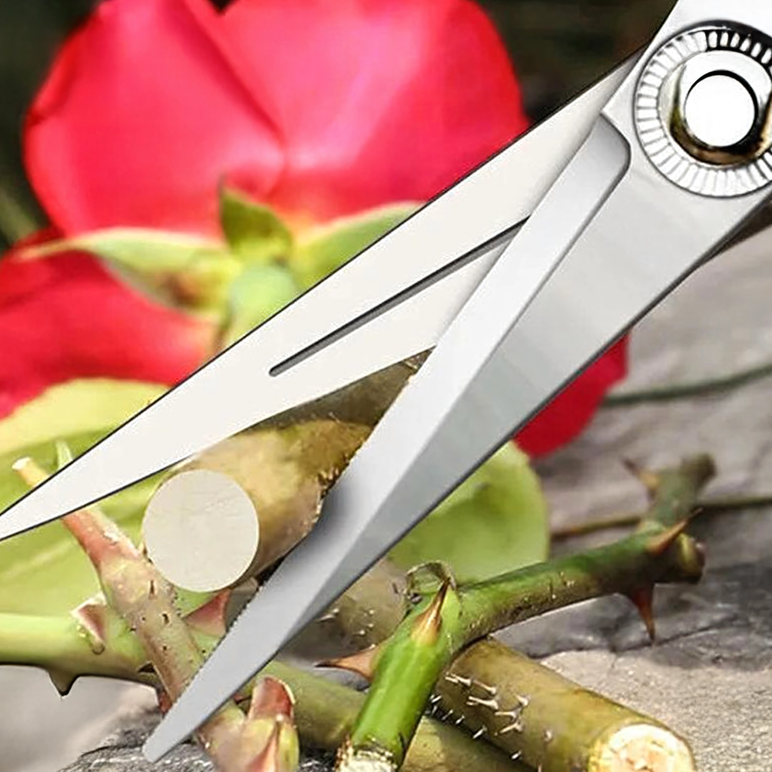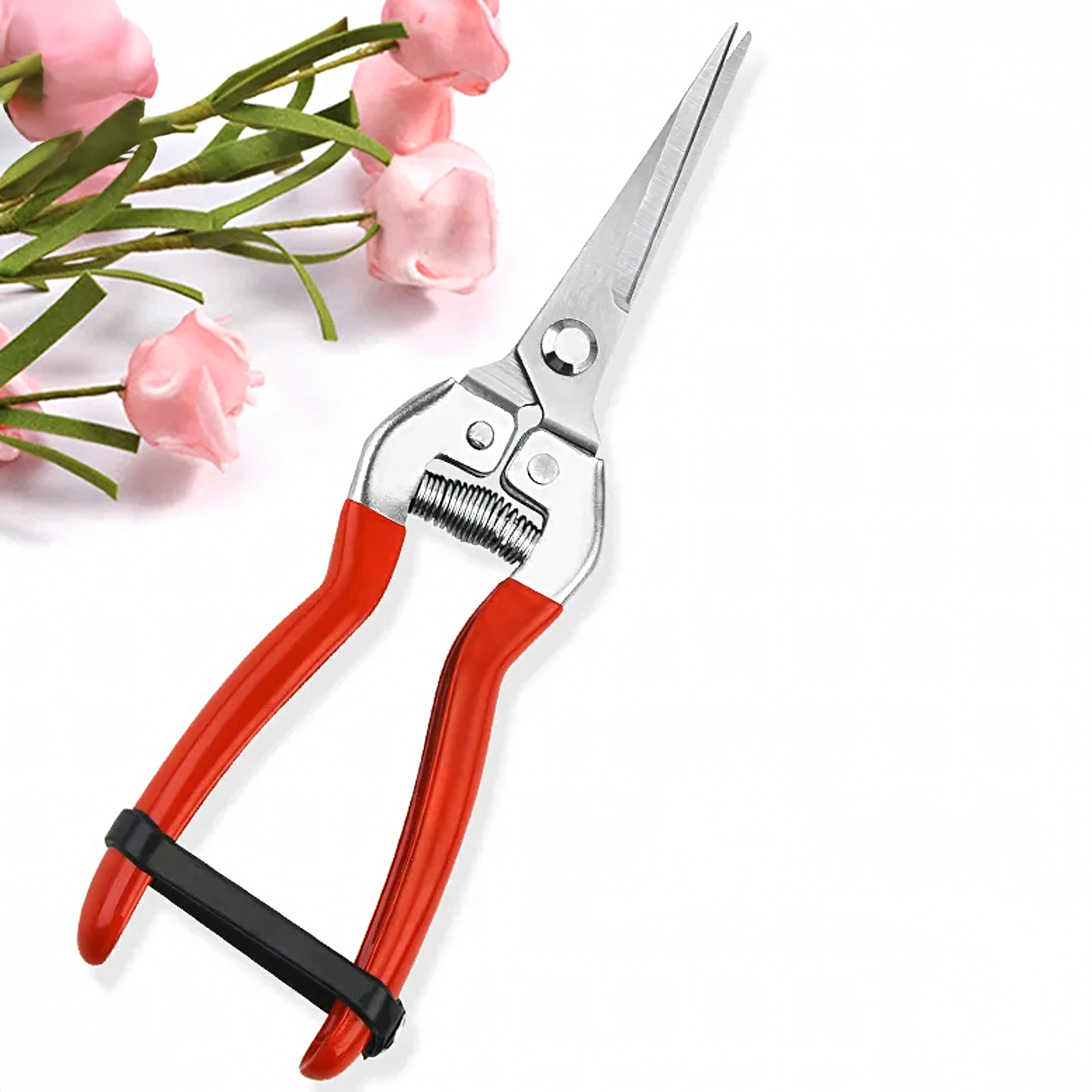 - Precyzyjne cięcie: wąskie, nierdzewne ostrza do czystych cięć łodyg i delikatnych gałązek.