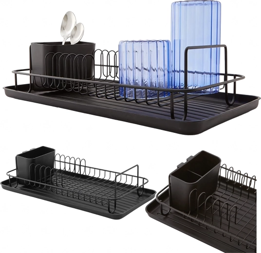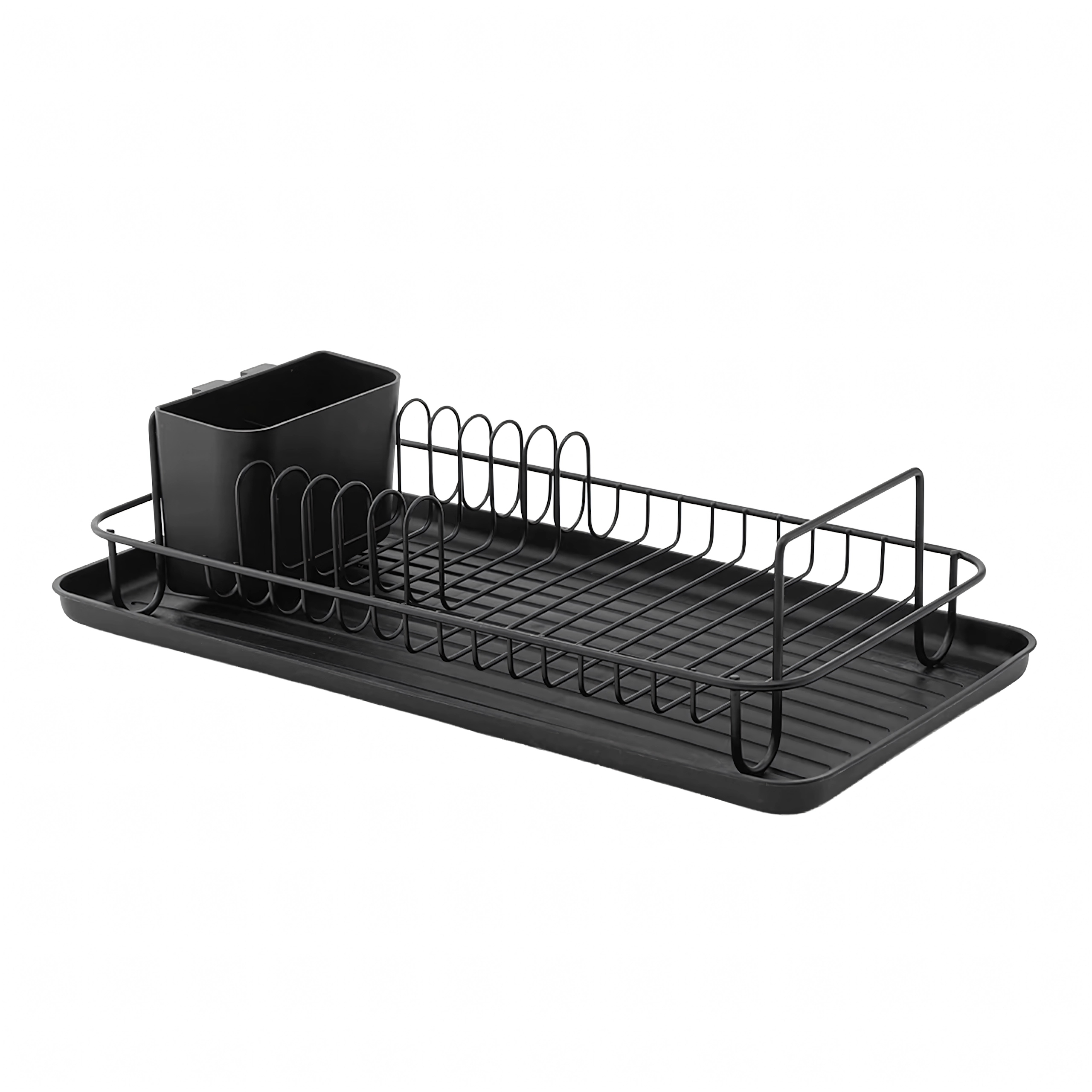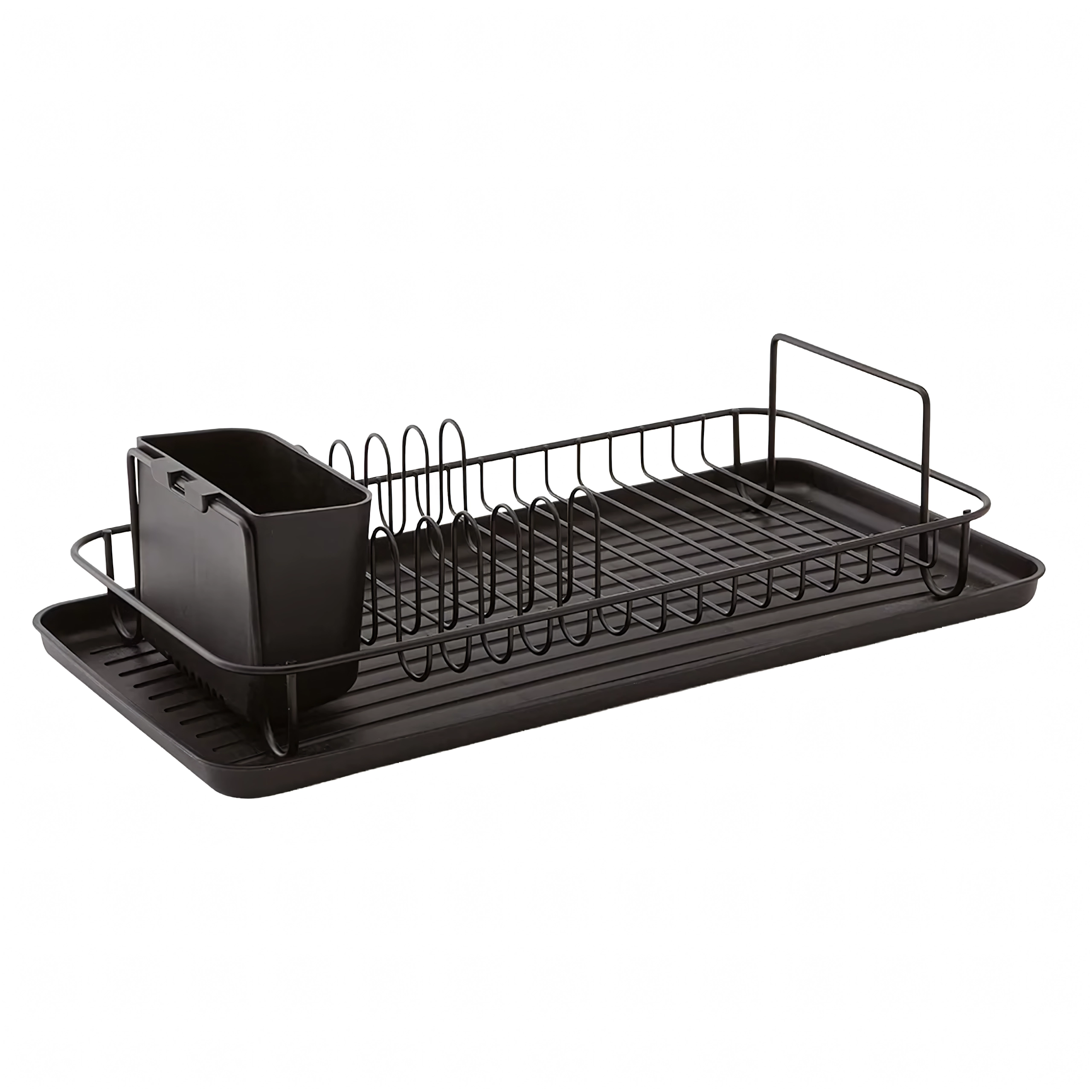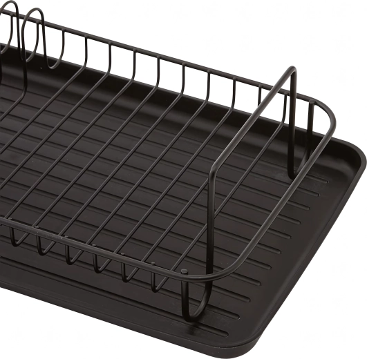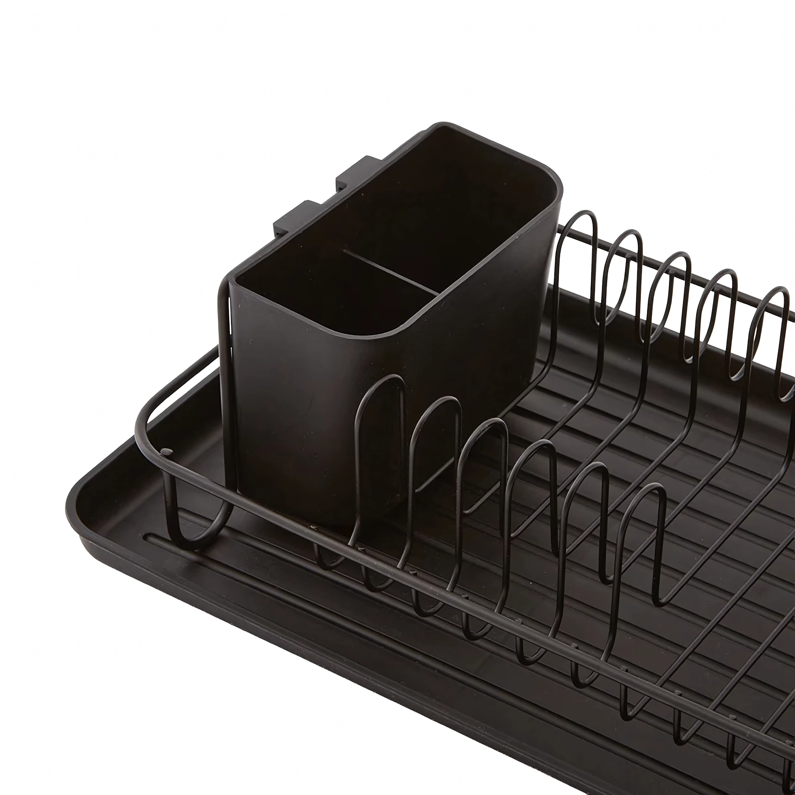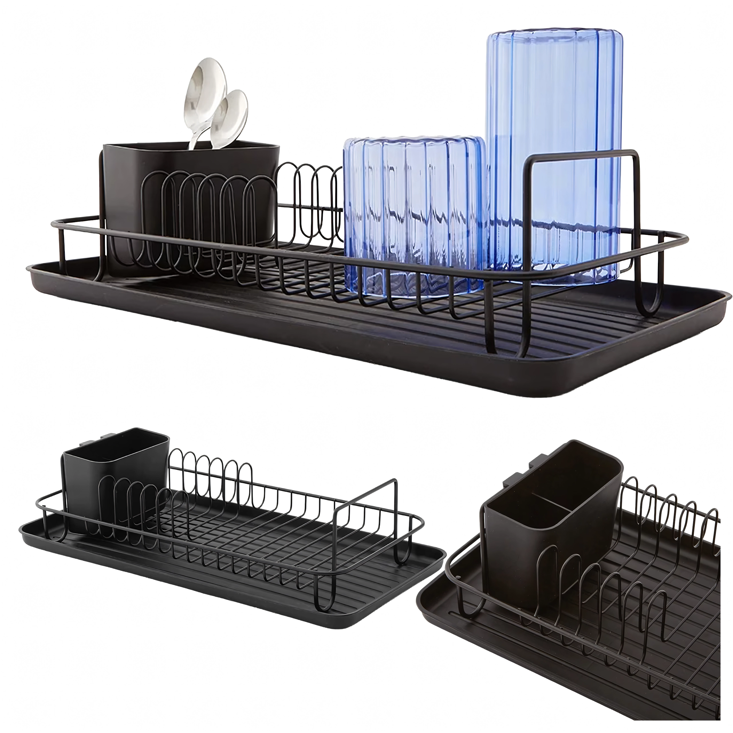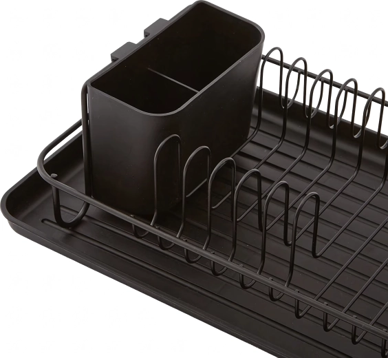 Elegancki czarny ociekacz do naczyń z metalową konstrukcją i wyjmowaną tacką ociekową utrzymuje kuchenny blat w czystości i suchości. Wkładki na talerze bezpiecznie trzymają naczynia w pozycji pionowej, boczna przestrzeń nadaje się na kubki lub miski, a oddzielny uchwyt na sztućce zapewnia przejrzyste przechowywanie widelców, noży i łyżek.