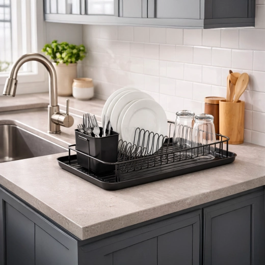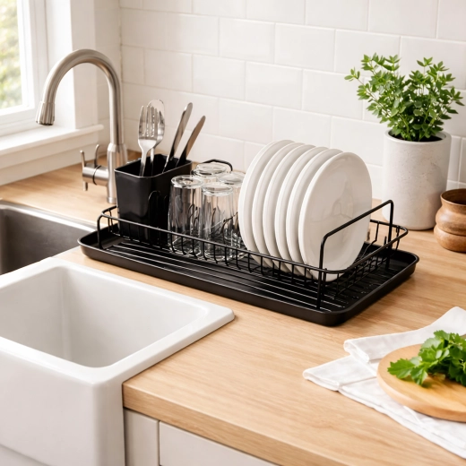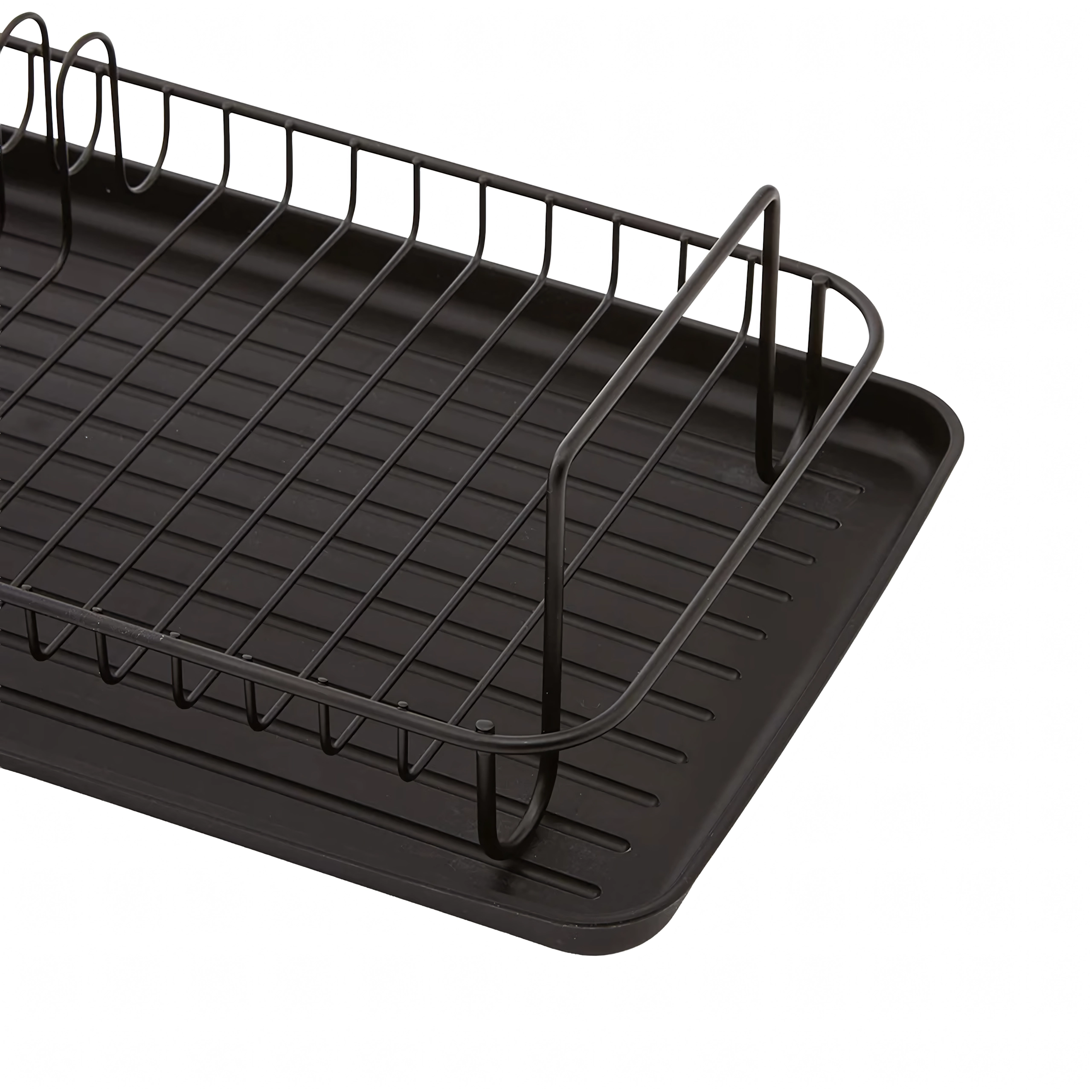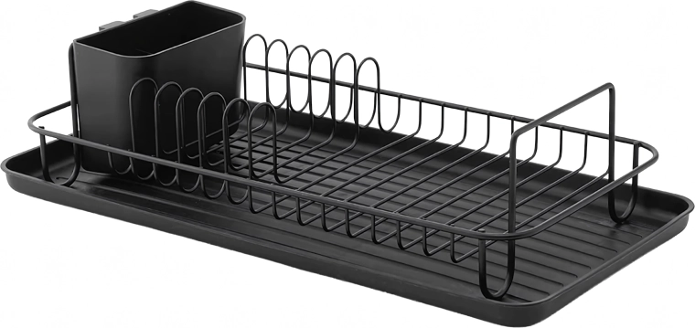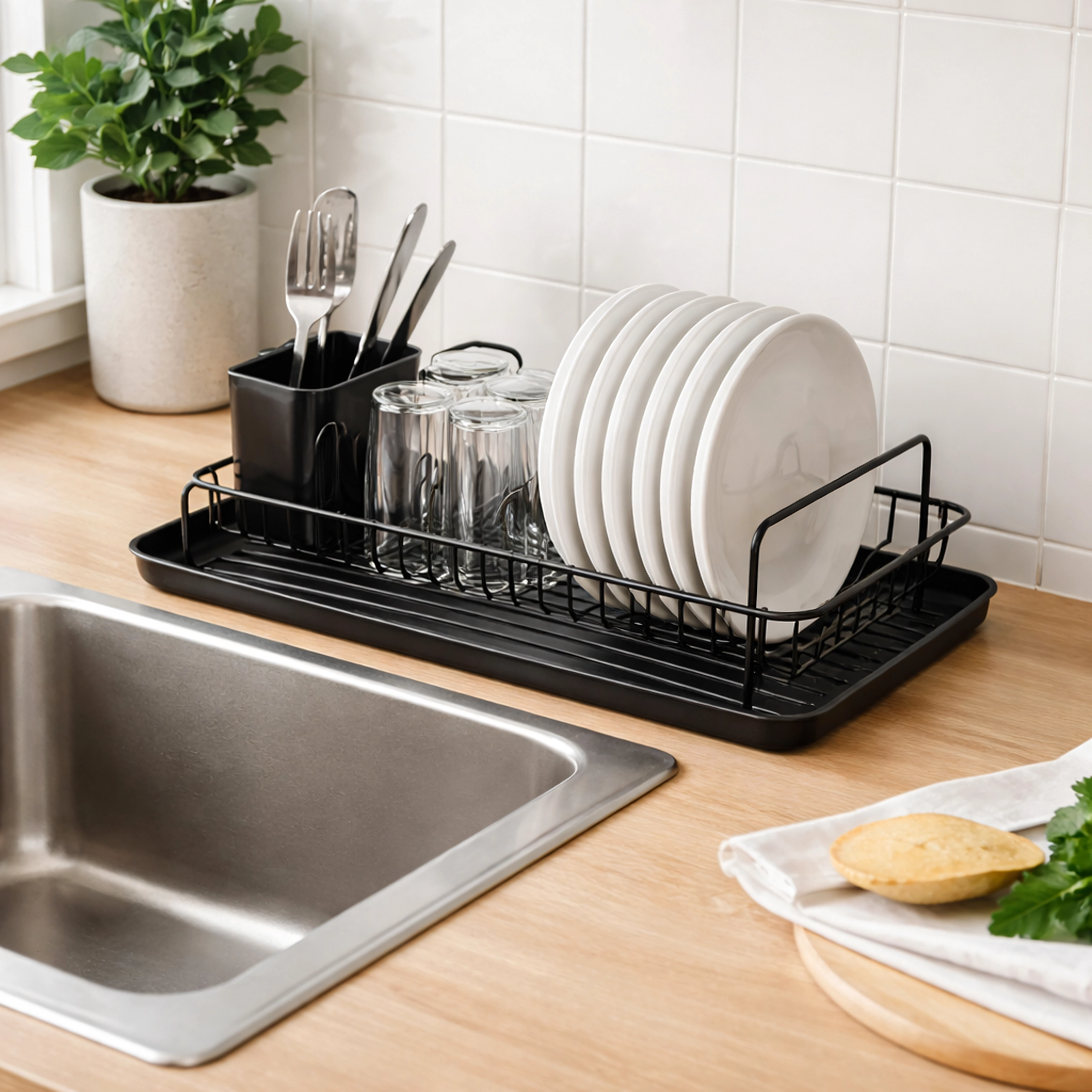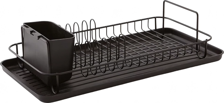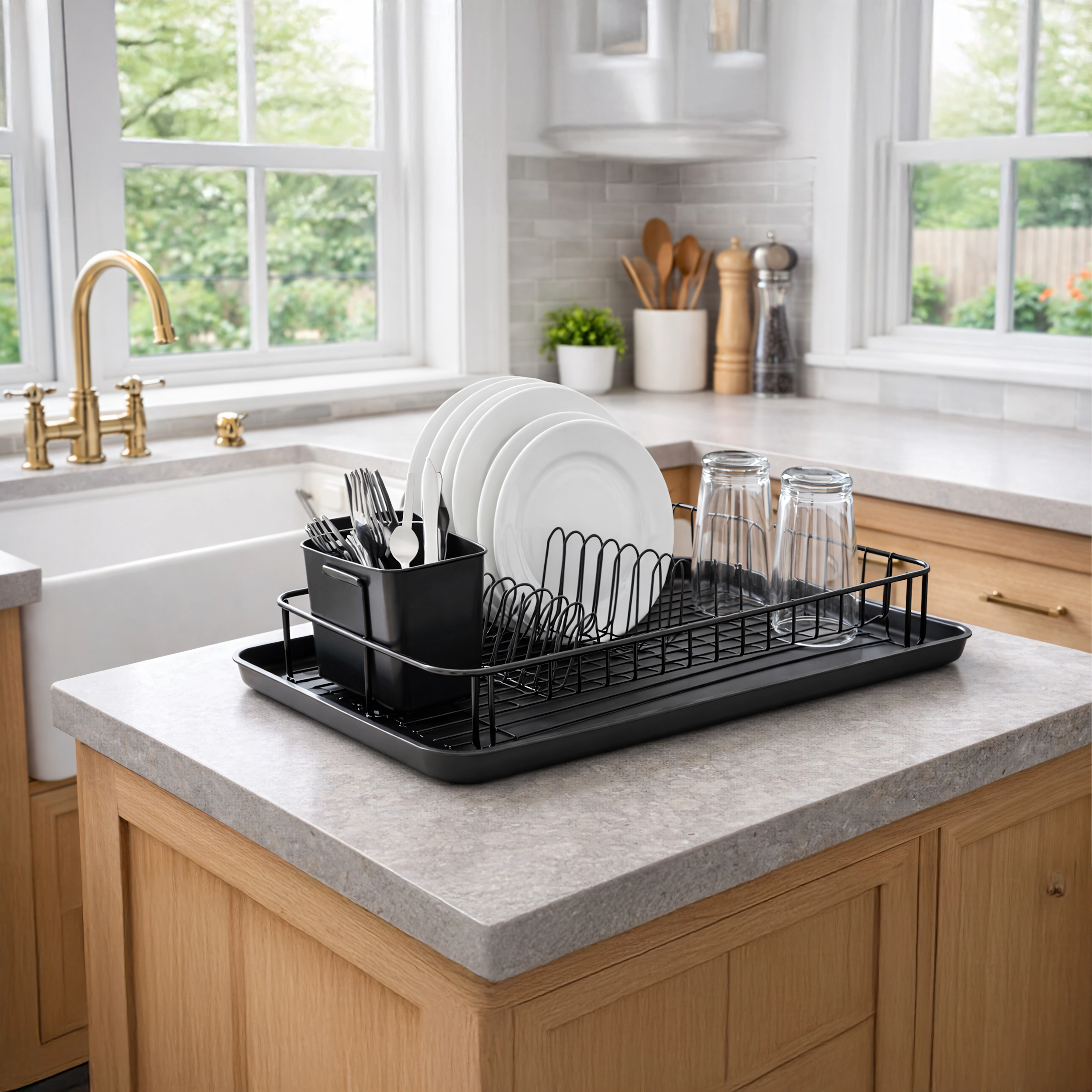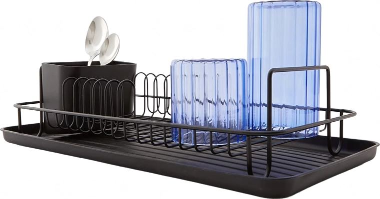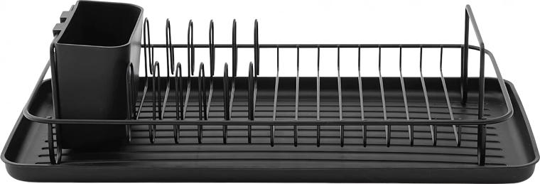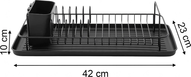 Elegancki czarny ociekacz do naczyń z metalową konstrukcją i wyjmowaną tacką ociekową utrzymuje kuchenny blat w czystości i suchości. Wkładki na talerze bezpiecznie trzymają naczynia w pozycji pionowej, boczna przestrzeń nadaje się na kubki lub miski, a oddzielny uchwyt na sztućce zapewnia przejrzyste przechowywanie widelców, noży i łyżek.