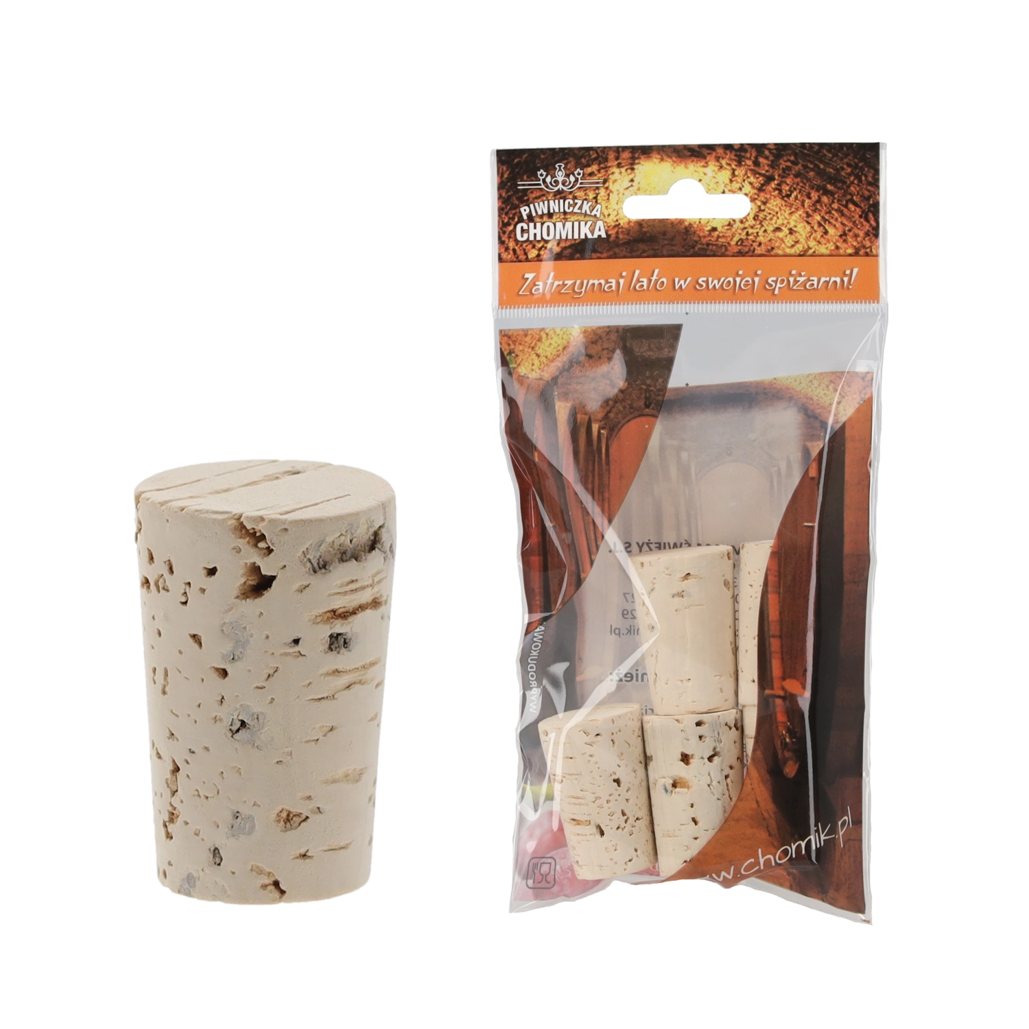 Praktyczny zestaw pięciu stożkowych korków o średnicy 25 mm do niezawodnego zamykania butelek i dam. Wykonane z naturalnego korka dla ekologicznego i bezpiecznego kontaktu z żywnością. Dzięki szczelnemu zamknięciu chronią napoje przed utlenianiem i zanieczyszczeniami, pomagając zachować świeżość i aromat domowych win, likierów oraz innych napojów.