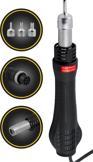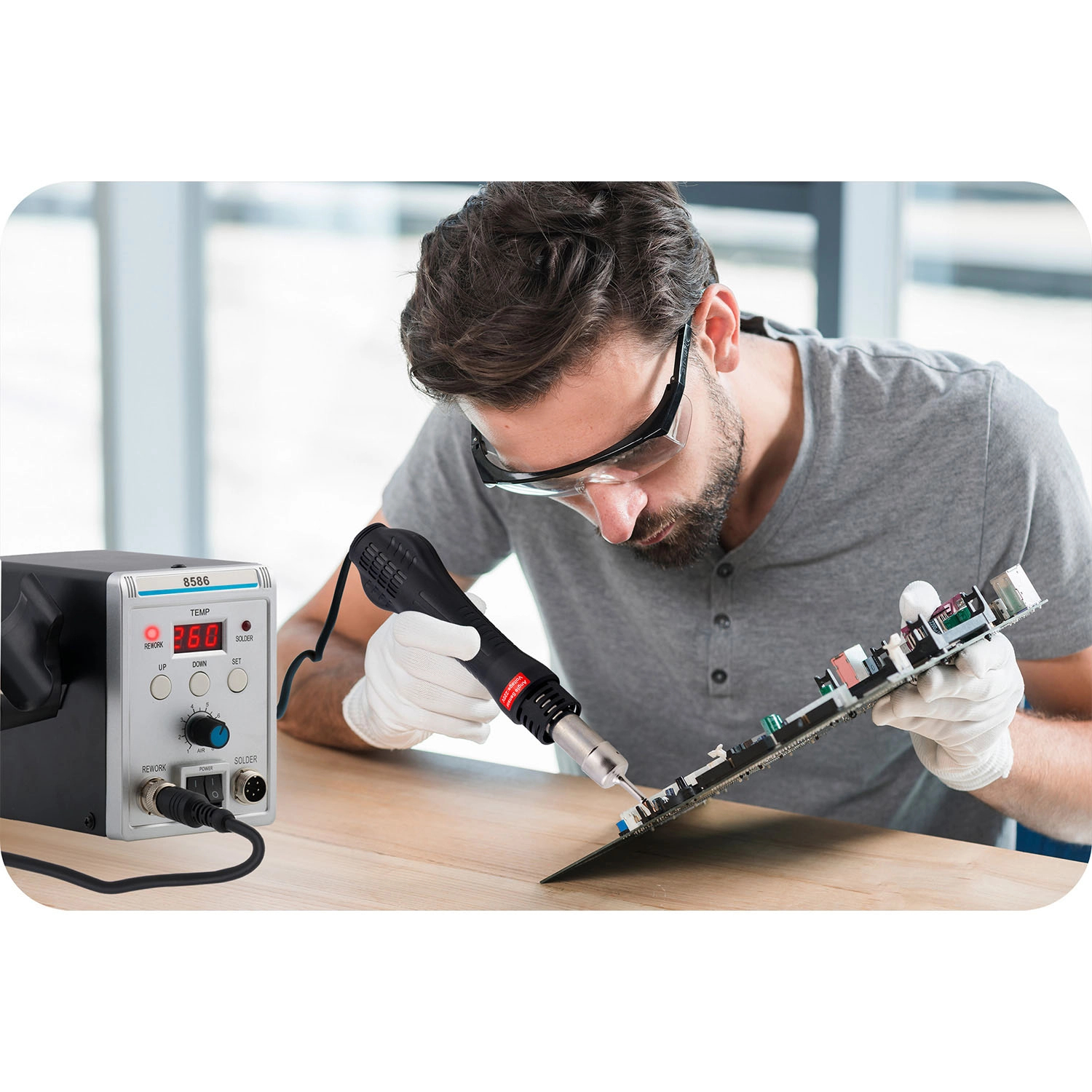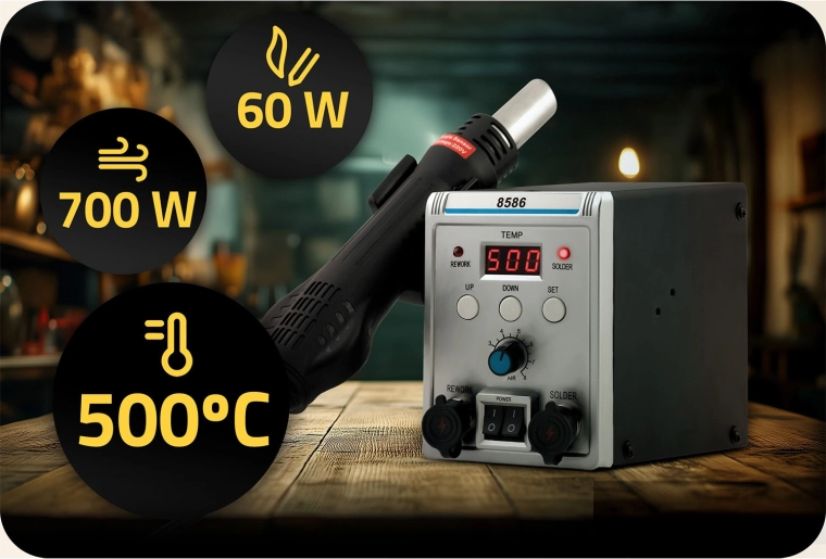 - Hot air (100–500 °C / 700 W): precyzyjne kierowanie ciepłem dzięki 5 dyszom, idealne do rozlutowywania SMD, reballingu BGA, koszulek termokurczliwych i usuwania klejów.