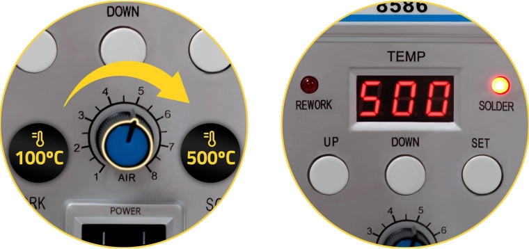 Lutowanie i rework w jednym – połączenie gorącego powietrza i klasycznej lutownicy rozszerza możliwości od montażu THT i SMD po reballing BGA. Przejrzysty wyświetlacz LCD oraz przyciski UP/DOWN/SET ułatwiają precyzyjne ustawienia, a regulacja przepływu powietrza (Air) zapewnia delikatne i równomierne nagrzewanie bez uszkadzania podzespołów.