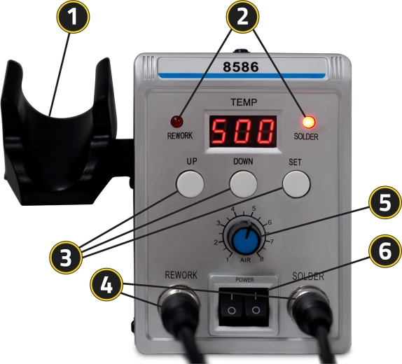 - Przyciski UP/DOWN/SET, przełączanie trybów Rework/Solder