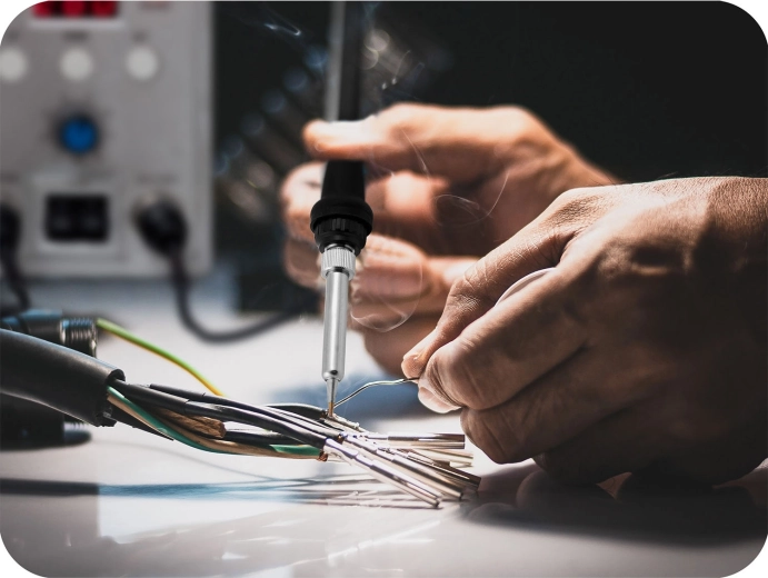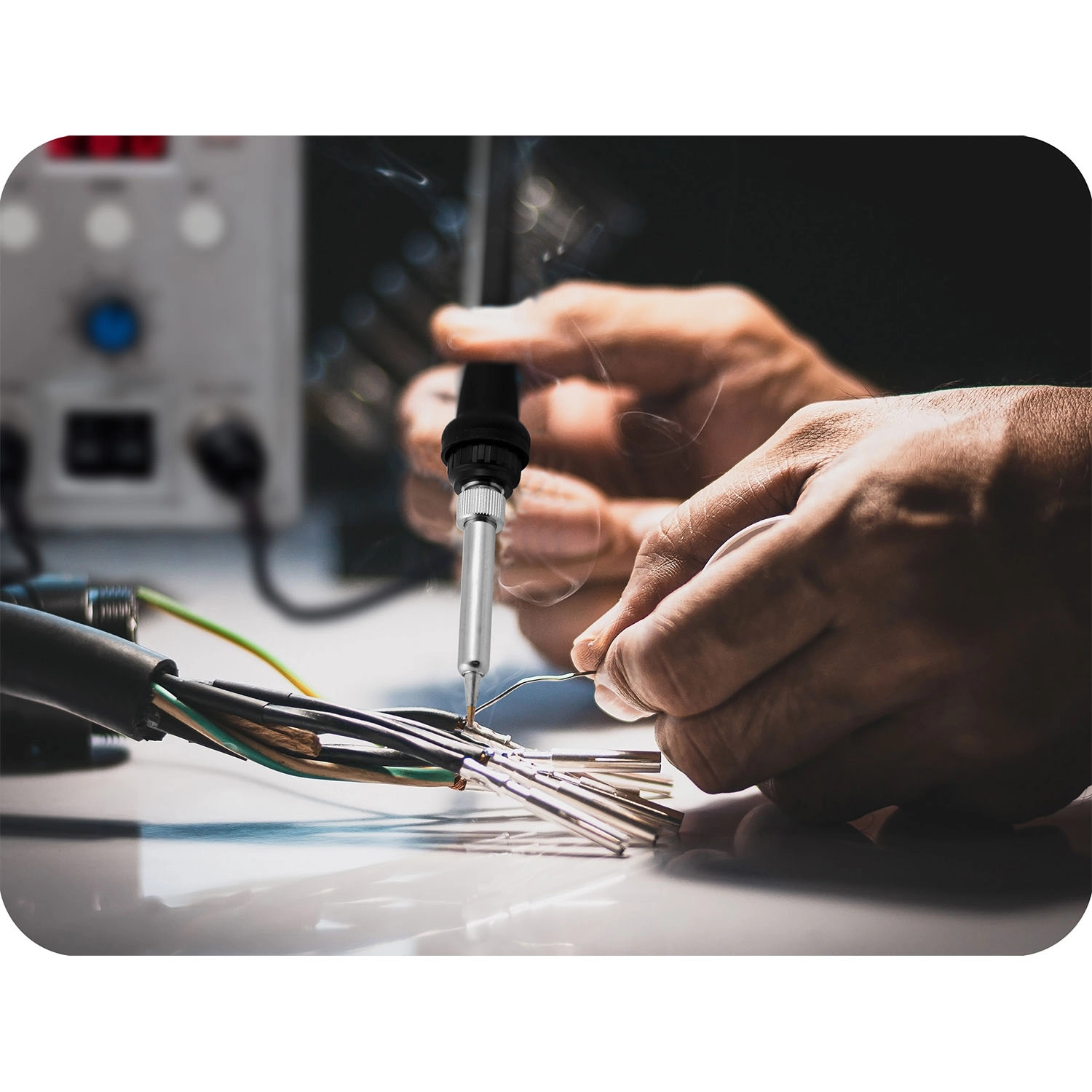 - Lutownica (200–500 °C / 60 W): kontrolowane ciepło do delikatnych połączeń, THT, przewodów i małych SMD z grotem stożkowym.