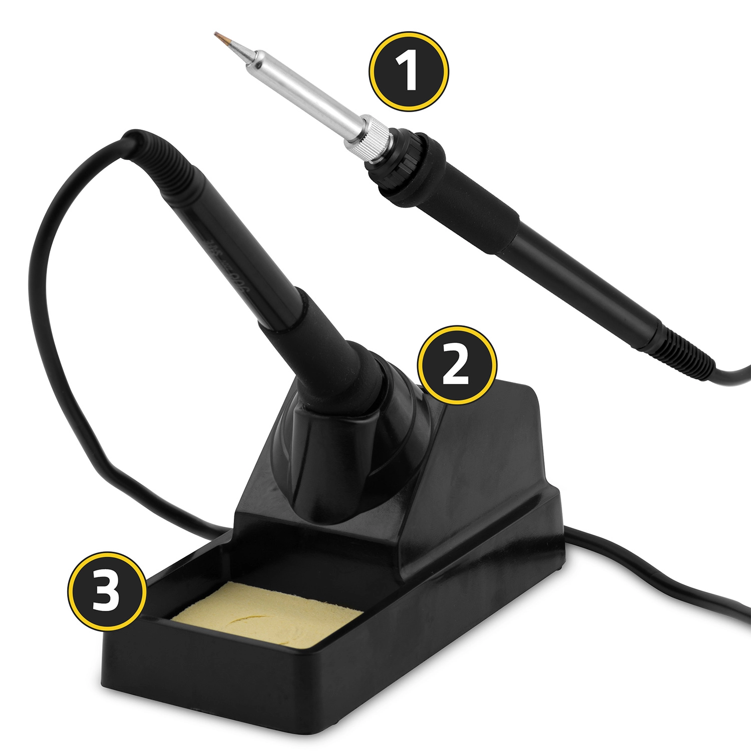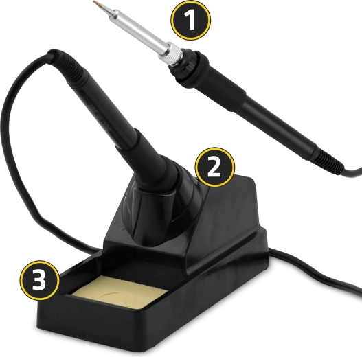 - Plecionka do rozlutowywania 2 mm, 1,5 m; spoiwo 10 g; uchwyt na lutownicę; gąbka do czyszczenia grotu