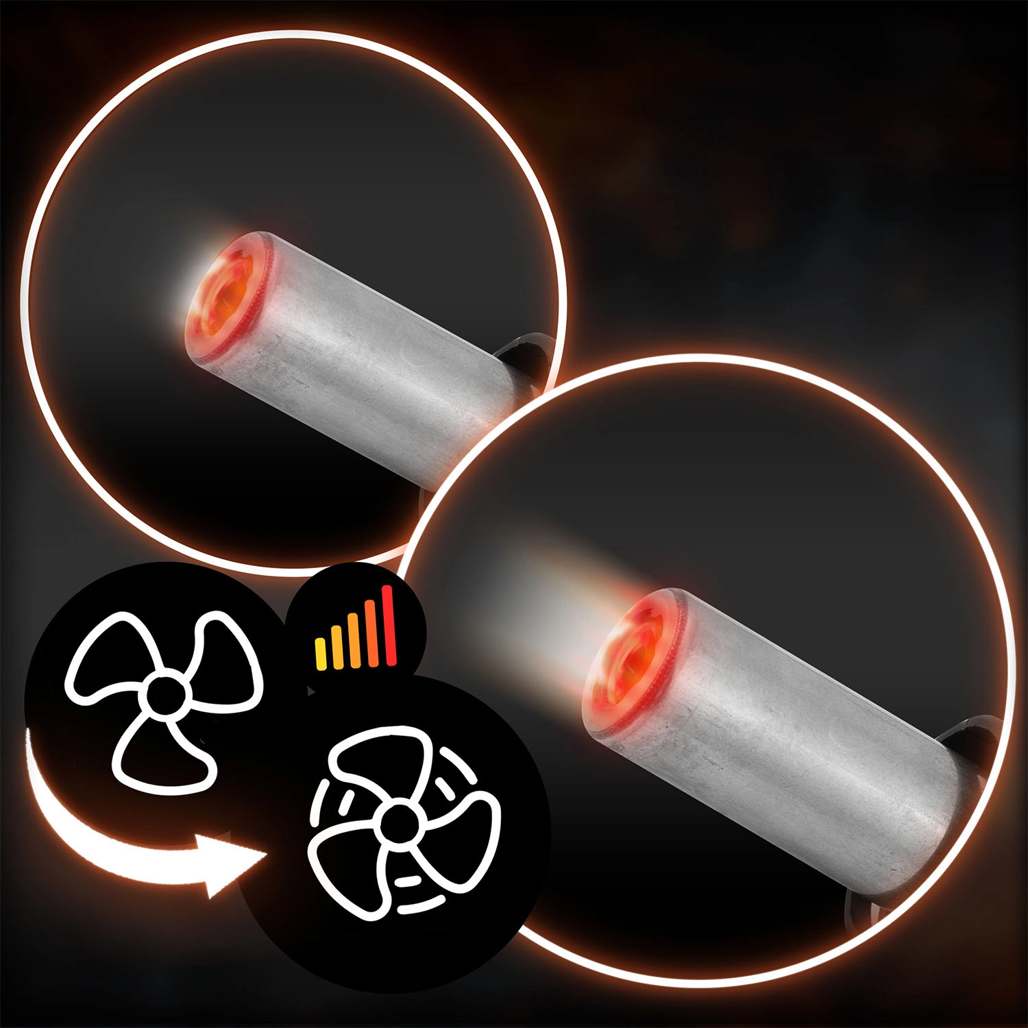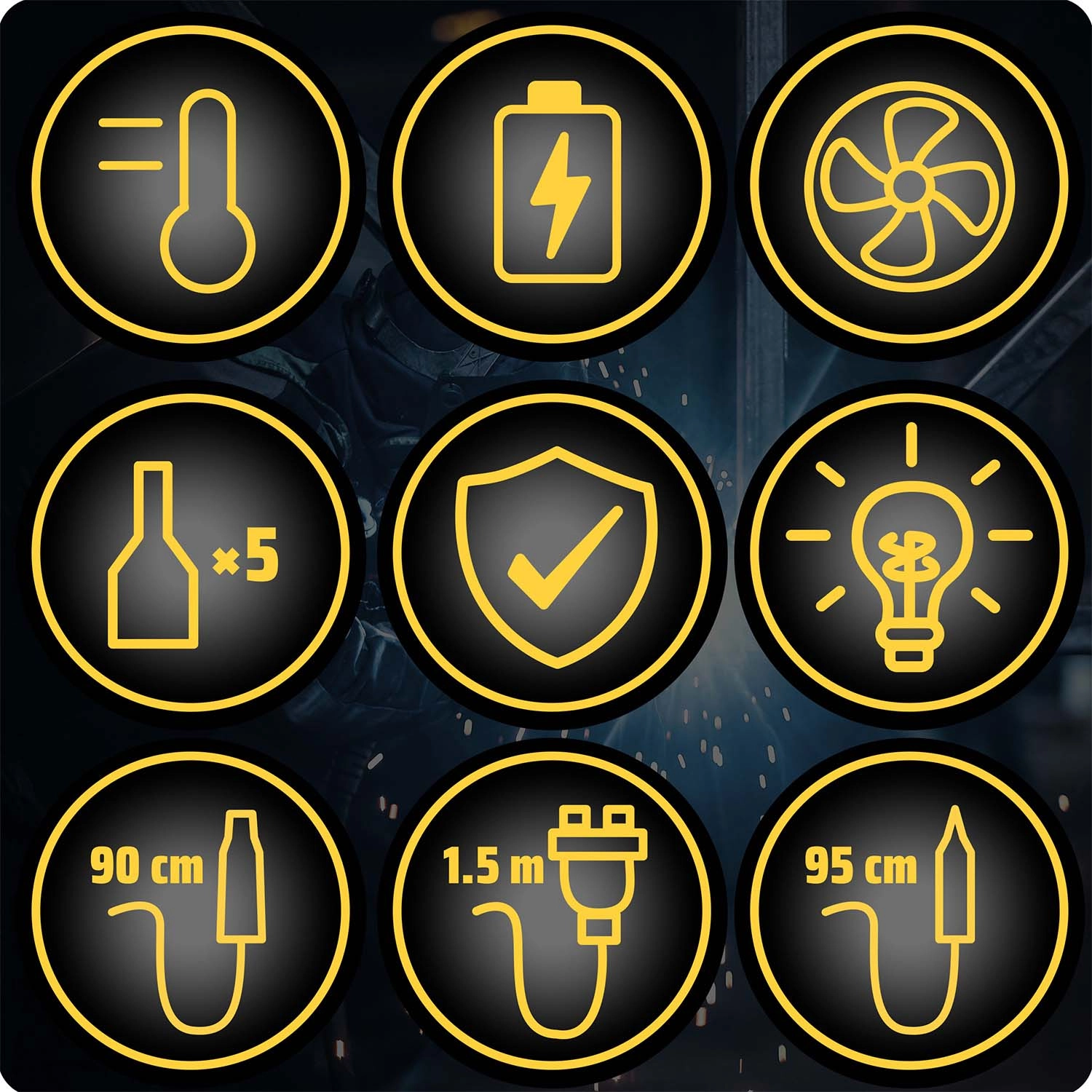 Stabilna wydajność i bezpieczeństwo gwarantowane są przez bezszczotkowy wentylator, kalibrację temperatury oraz automatyczne uśpienie poniżej 80 °C dla dłuższej żywotności i oszczędności energii. Praktyczny uchwyt na rączkę i gąbka czyszcząca podnoszą komfort pracy.