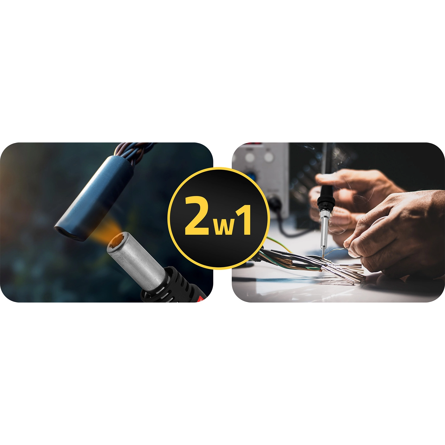 Uniwersalna stacja lutownicza 2w1 marki HUMBERG łączy w jednej obudowie stację gorącego powietrza 700 W (100–500 °C) oraz lutownicę 60 W (200–500 °C). Oferuje bezszczotkowy wentylator dla stabilnego przepływu powietrza, wyświetlacz LCD, kalibrację temperatury oraz automatyczny tryb uśpienia. W zestawie znajdziesz 5 wymiennych dysz, plecionkę do rozlutowywania i spoiwo lutownicze do natychmiastowego użycia.