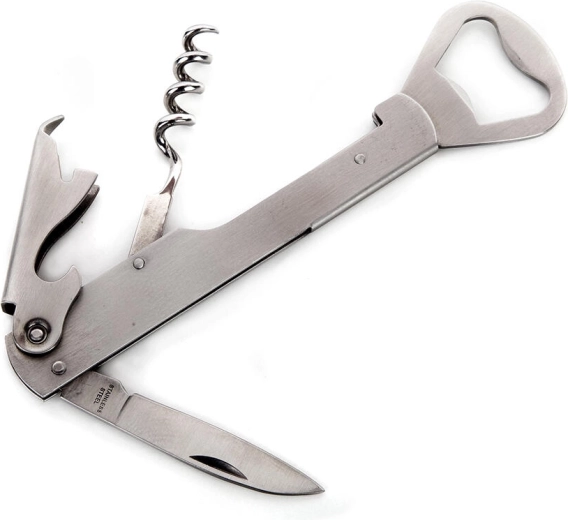 Praktyczny kelnerski otwieracz w solidnym wykonaniu do łatwego otwierania wina i piwa. Łączy korkociąg i dźwignię do korka z otwieraczem do kapsli, jest wykonany z wytrzymałej stali nierdzewnej i doskonale leży w dłoni. Idealny do domu i gastronomii. Uniwersalne zastosowanie, wysokiej jakości stal nierdzewna, wygodna obsługa.