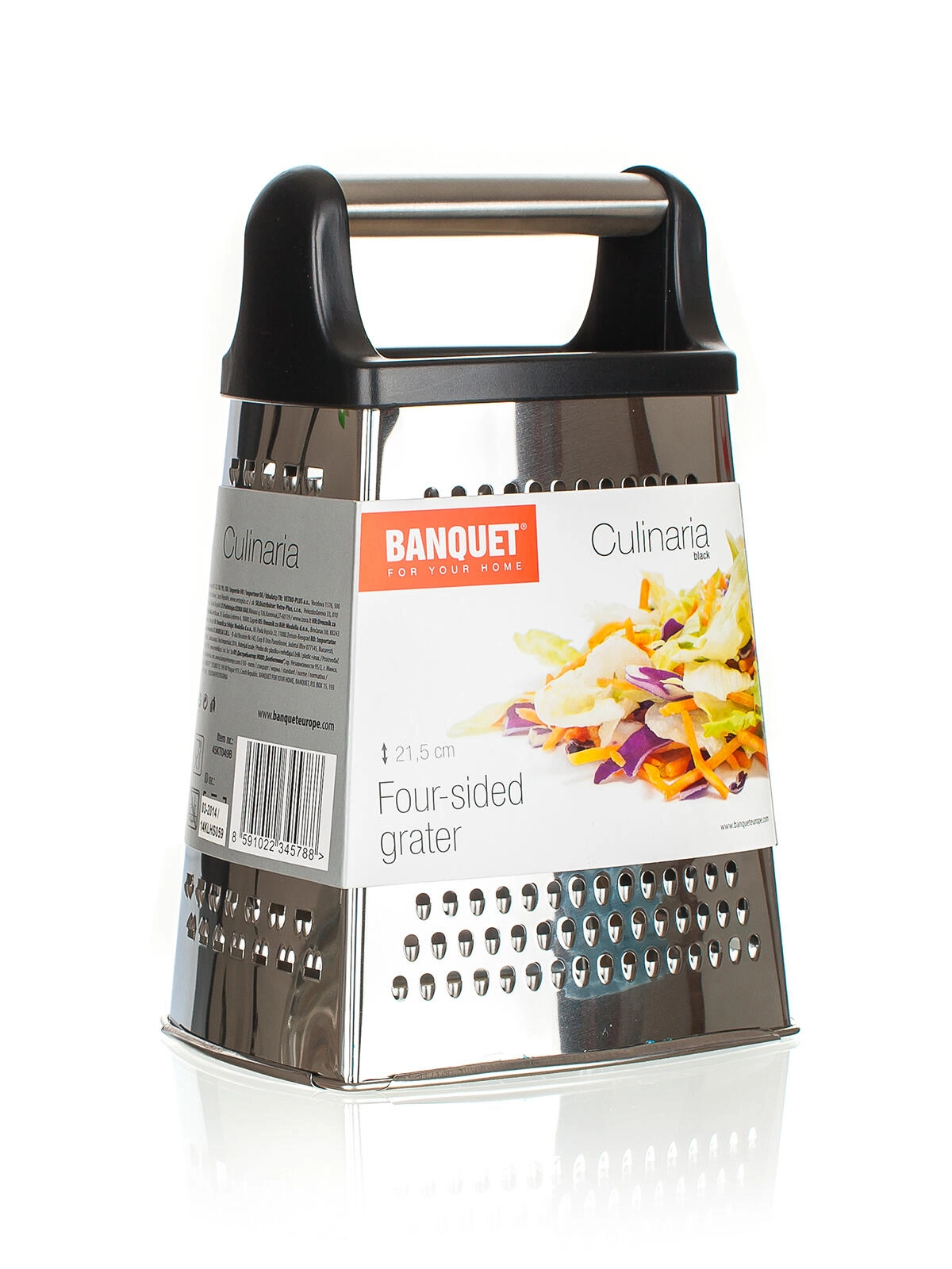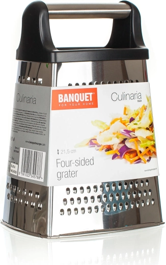 Uniwersalna kuchenna tarka CULINARIA łączy solidne stalowe, nierdzewne ścianki z ergonomiczną plastikową rączką dla bezpiecznego i pewnego chwytu. Dzięki czterem funkcjonalnym stronom łatwo dobierzesz właściwą grubość do drobnego tarcia, grubego tarcia, plasterkowania lub dekoracyjnych wiórków.