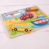 Zabawna drewniana układanka z pojazdami dla najmłodszych. Zawiera 5 dużych elementów z uchwytami, które dzieci łatwo umieszczają w odpowiednich otworach. Wspiera małą motorykę, koordynację, naukę kształtów i kolorów oraz rozwój słownictwa. Wykonana z wysokiej jakości drewna i spełnia europejskie normy bezpieczeństwa.