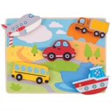 Odkrywaj świat transportu w formie zabawy. Drewniana układanka z motywem samolotu, samochodu, autobusu, ciężarówki i statku zachęca dzieci do rozpoznawania kształtów i kolorów, a jednocześnie rozwija ich słownictwo. Elementy są wystarczająco duże i wygodne dla dziecięcej dłoni.