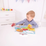 Pięć kolorowych elementów (samolot, samochód, autobus, ciężarówka i statek) pomaga dzieciom naturalnie poszerzać słownictwo oraz rozpoznawać kształty i kolory.
