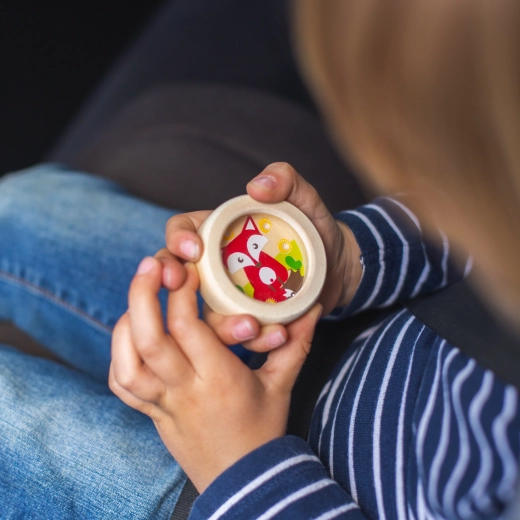 Dzięki solidnemu, drewnianemu korpusowi i przezroczystej osłonie zabawka jest trwała i bezpieczna. Doskonale leży w dziecięcej dłoni i łatwo mieści się w plecaku – świetna w podróży, w poczekalni i w domu.