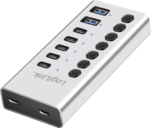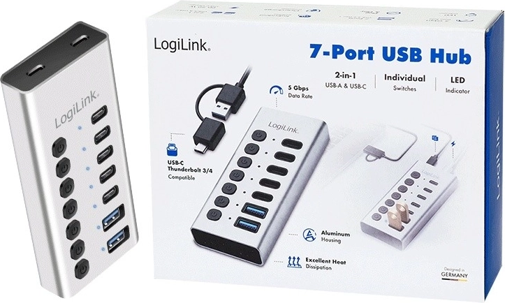 Rozszerz podłączenia swojego komputera, laptopa lub tabletu za pomocą wydajnego huba USB LOGILINK z 7 portami, indywidualnymi wyłącznikami oraz kablem 2 w 1 (USB‑A/USB‑C). Oferuje szybki transfer danych do 5 Gbit/s, stabilne zasilanie dzięki dołączonej ładowarce USB‑C 20 W oraz wytrzymałe aluminiowe obudowy do codziennego użytku w domu, biurze i dla graczy.