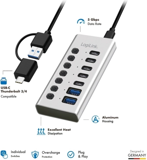 Hub USB 3.2 Gen 1 od LOGILINK umożliwia jednoczesne podłączenie wielu urządzeń i wygodne sterowanie każdym z nich za pomocą osobnego wyłącznika. Dzięki innowacyjnemu kablowi 2 w 1 łatwo podłączysz go zarówno do klasycznego portu USB‑A, jak i nowoczesnego USB‑C.