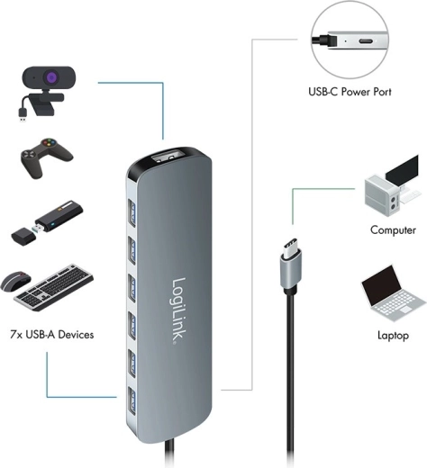 Rozszerz łączność jednym kablem. Ten hub LogiLink dodaje siedem szybkich portów USB‑A dla dysków, klawiatur, myszy, czytników i innego akcesoriów. Prędkość transferu do 5 Gb/s przyspieszy Twoją pracę – od tworzenia kopii zapasowych po przesył multimediów.