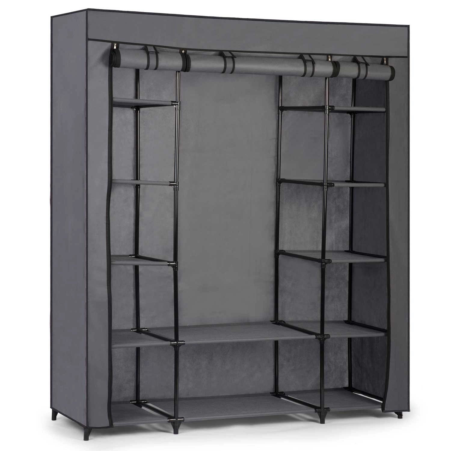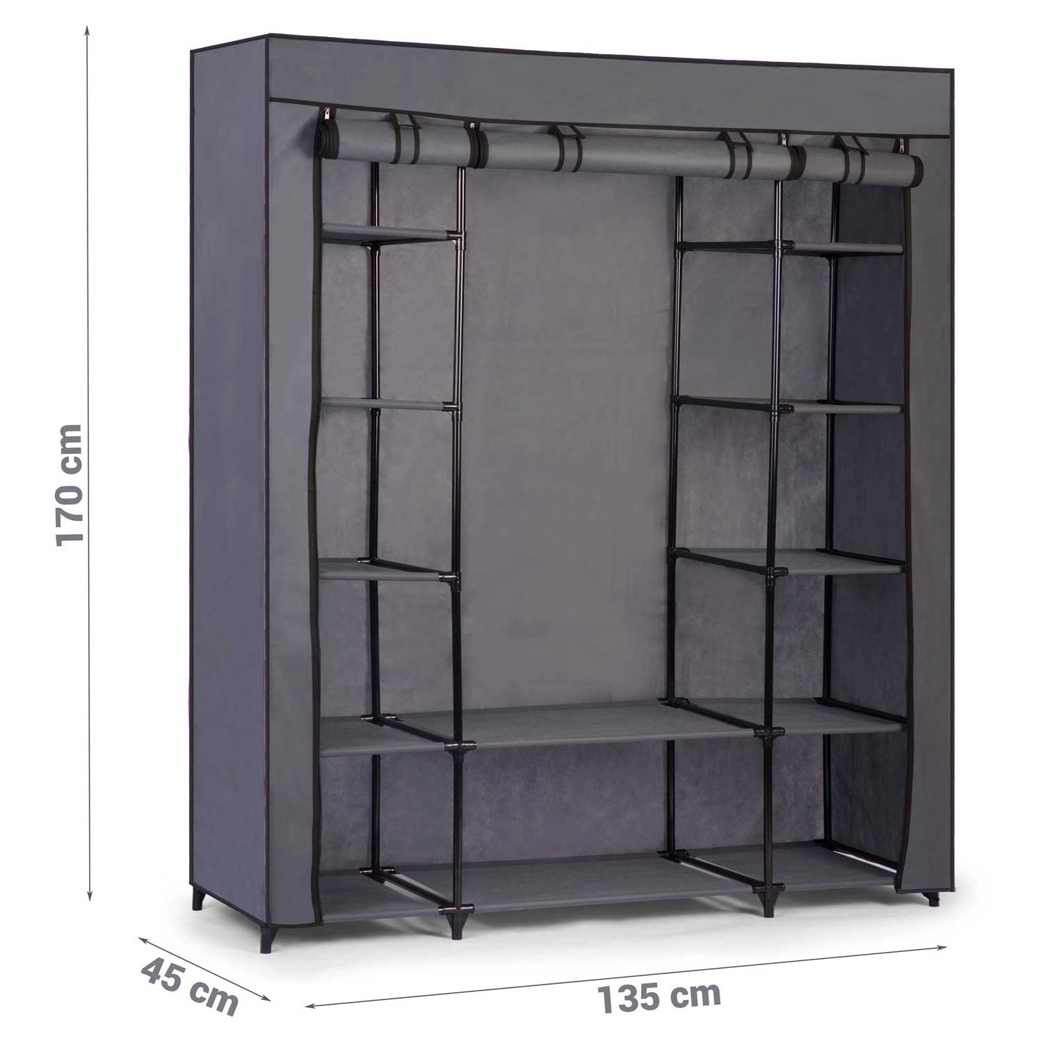 Praktyczna i pojemna tekstylna szafa Massido w kolorze grafitowym oferuje 12 solidnych półek, drążek na wieszaki oraz stalową ramę dla wysokiej stabilności. Trzy oddzielne sekcje z własnymi drzwiami i czterema zamkami błyskawicznymi gwarantują wygodny dostęp i przejrzyste przechowywanie. Trwały, wodoodporny materiał oraz łatwy, intuicyjny montaż czynią tę szafę idealnym rozwiązaniem do sypialni, garderoby i przedpokoju.