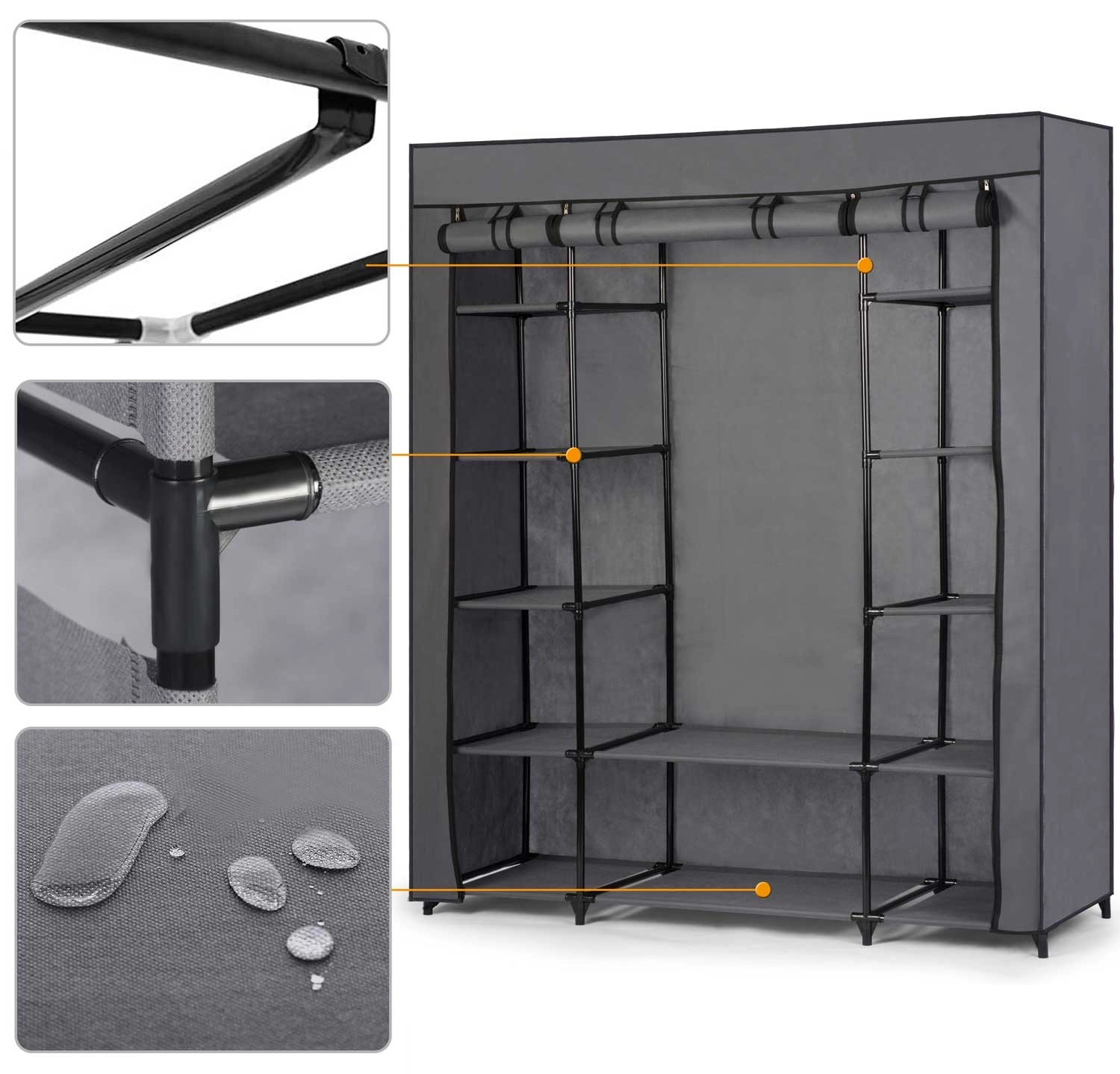 Tekstylna szafa Massido – grafitowa to świetny wybór, gdy potrzebujesz szybko i skutecznie zwiększyć przestrzeń do przechowywania. Dzięki połączeniu stalowego stelaża i solidnych łączników PP konstrukcja jest stabilna i długotrwale odporna. Wodoodporny pokrowiec chroni ubrania przed kurzem i wilgocią, a przemyślany podział na trzy wydzielone strefy pozwala łatwo sortować i organizować wszystko – od koszulek po płaszcze.