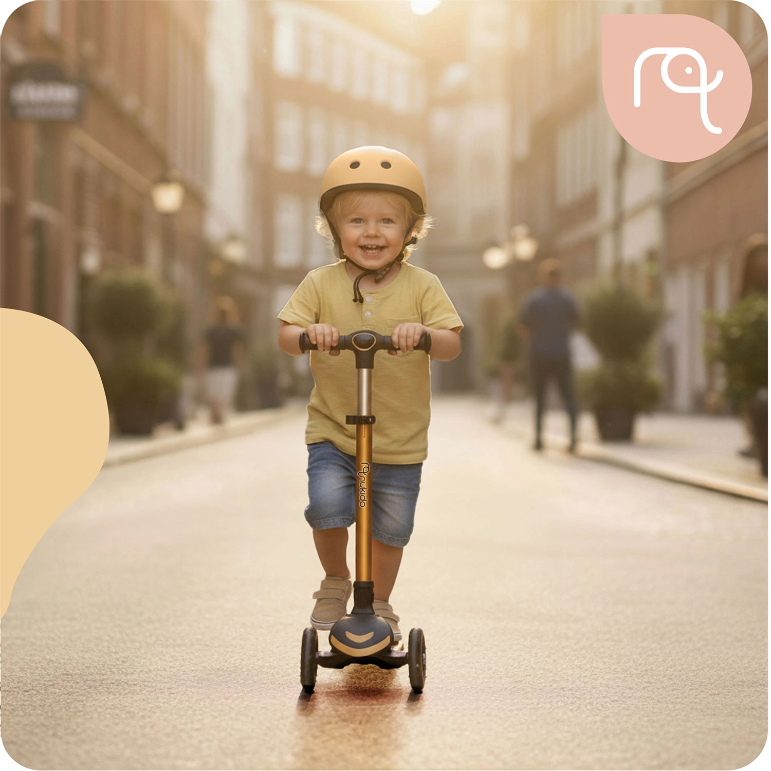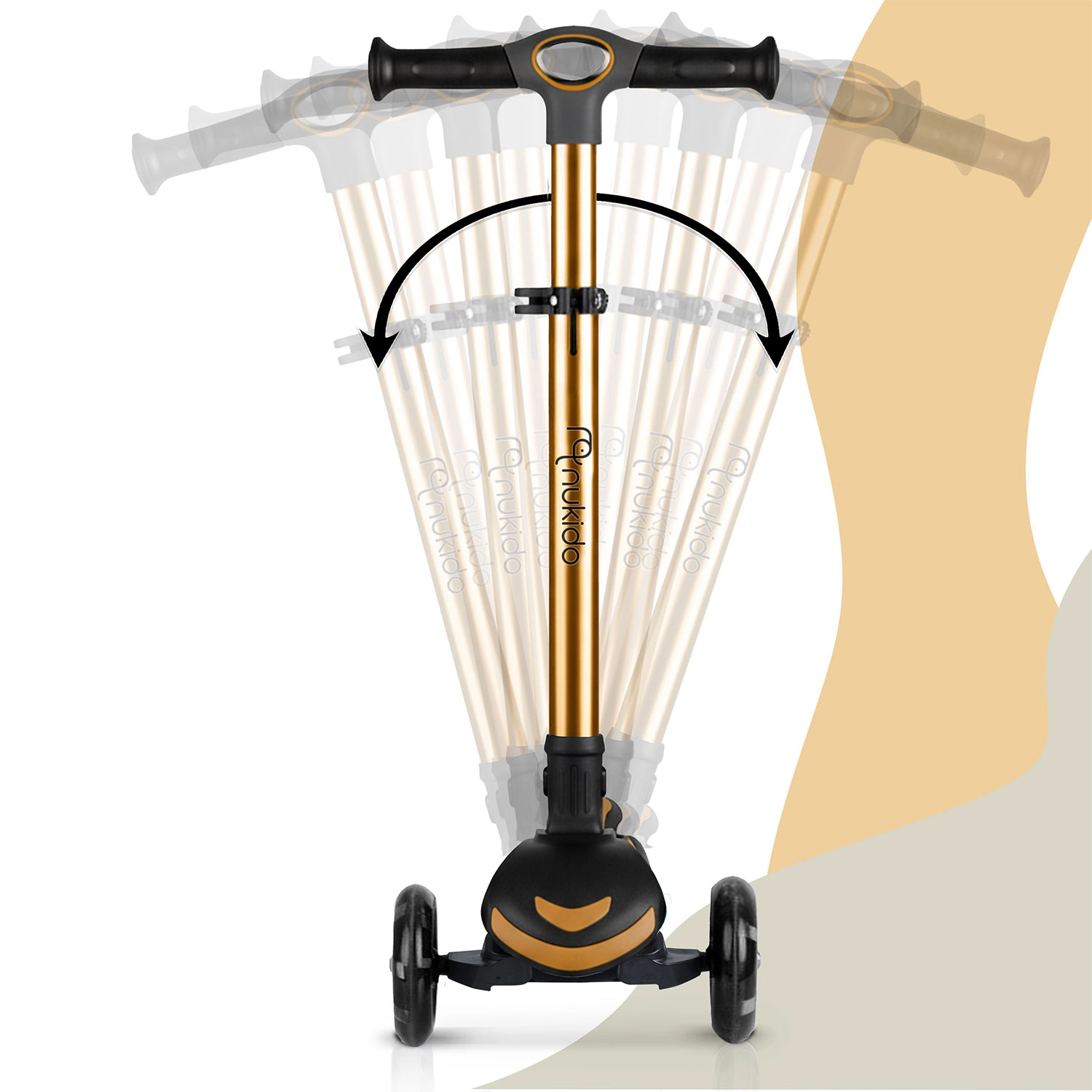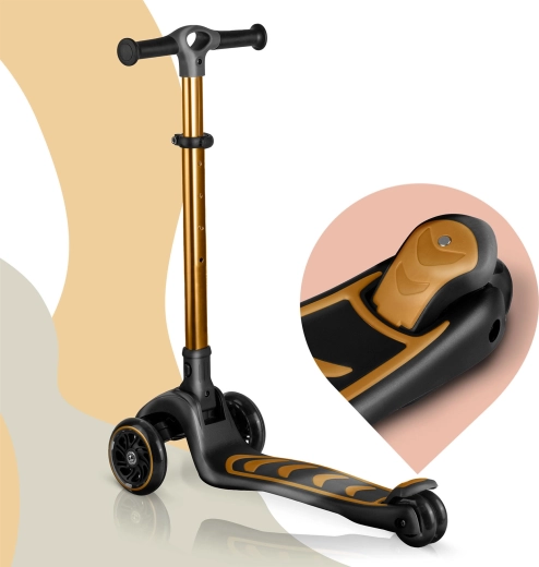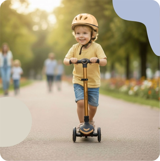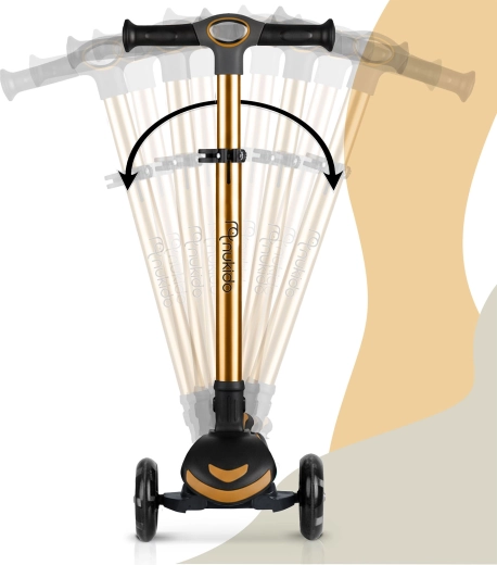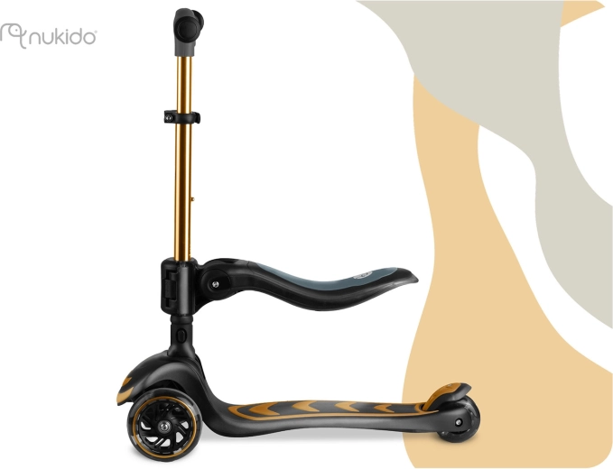 NUKIDO Flippo to lekka i wytrzymała dziecięca hulajnoga trójkołowa zaprojektowana dla bezpiecznego startu. Dwa duże przednie koła i mniejsze tylne koło zapewniają stabilność, a system sterowania przechyłem rozwija równowagę i koordynację. Szeroki, antypoślizgowy podest oraz skuteczny tylny hamulec nożny pomagają utrzymać kontrolę w każdej sytuacji.