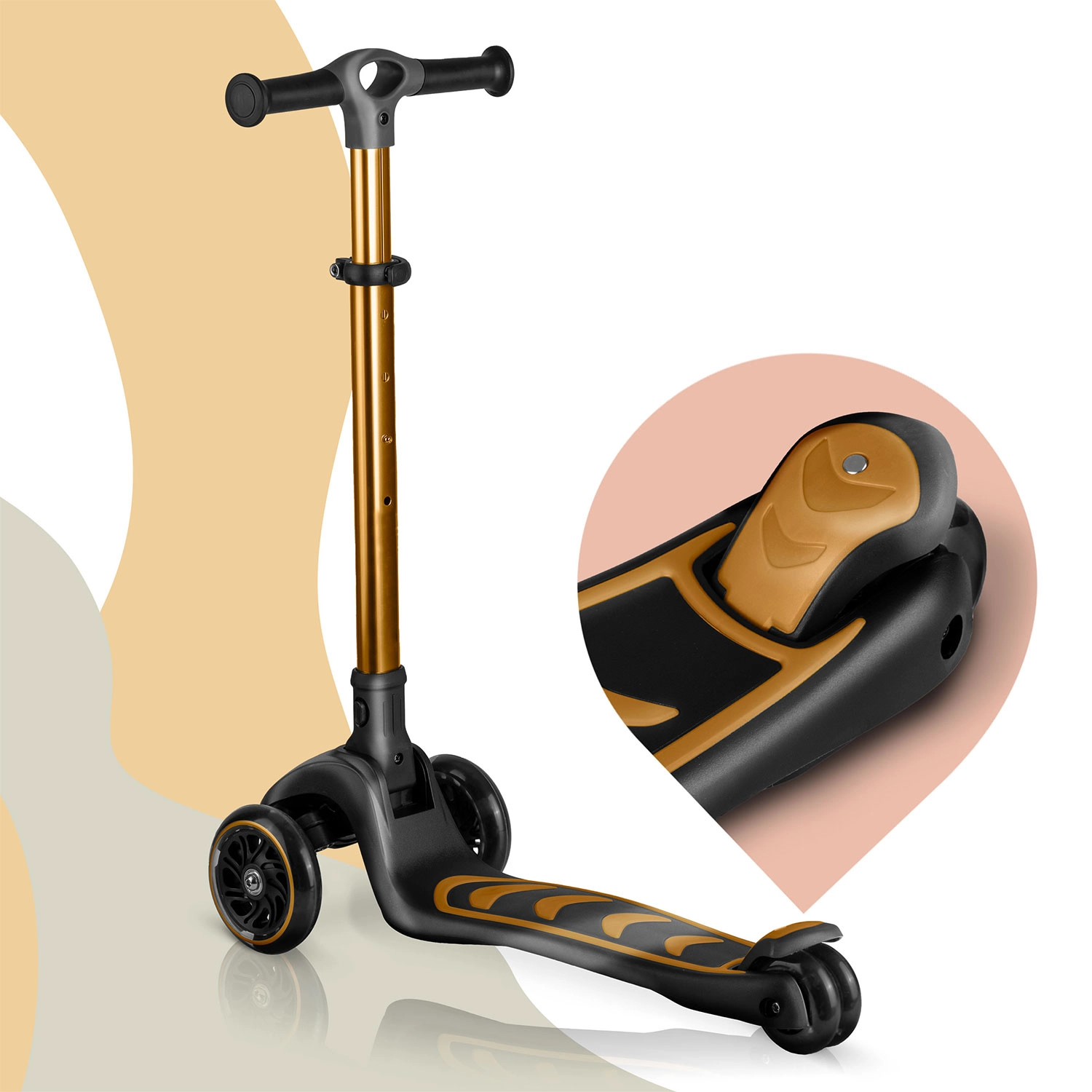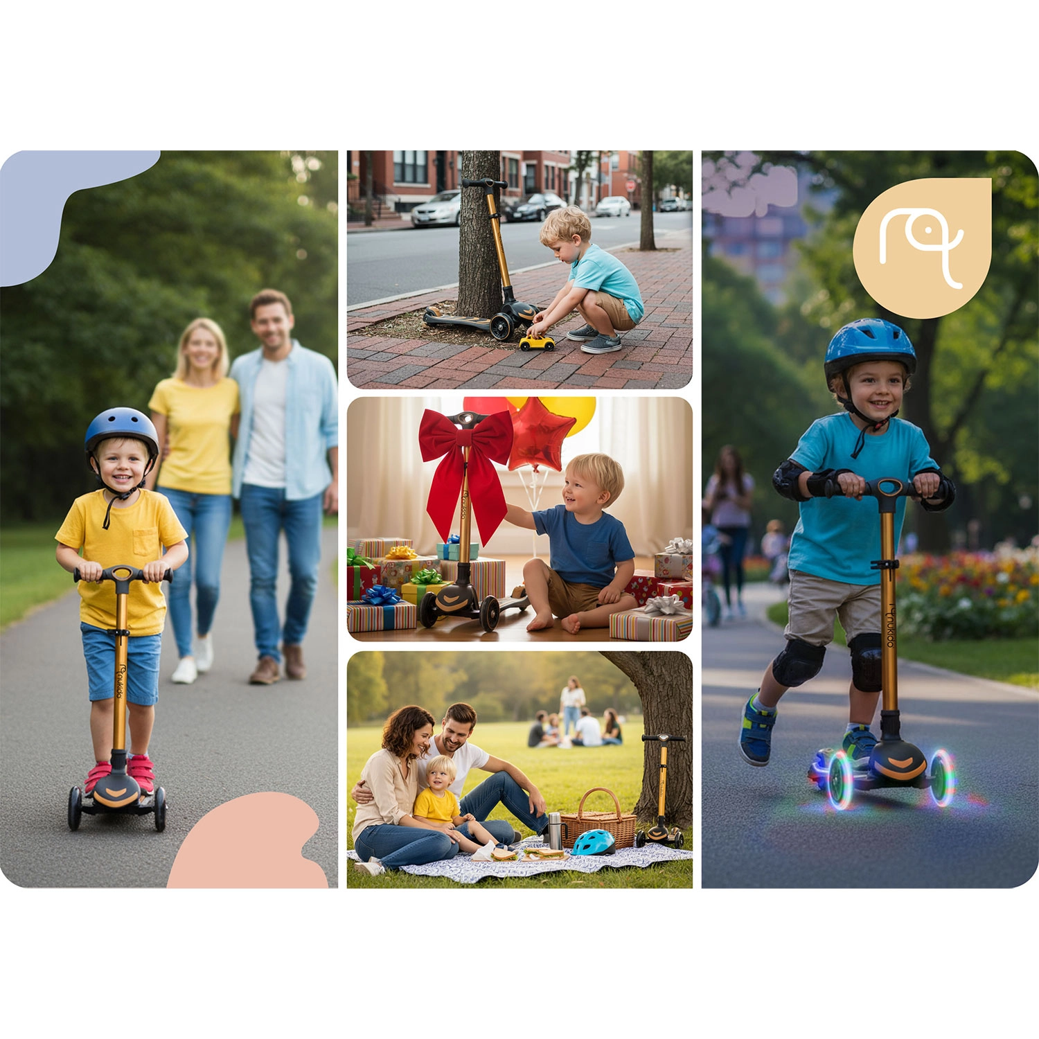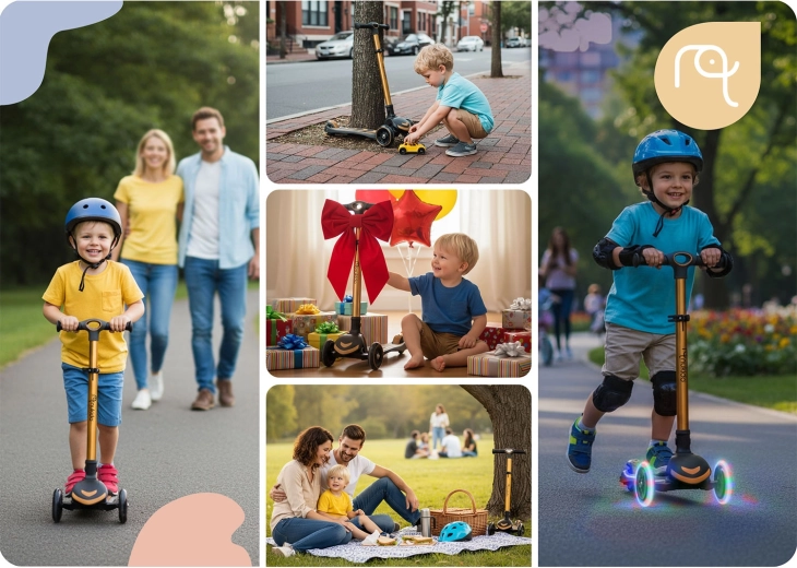 NUKIDO Flippo to lekka i wytrzymała dziecięca hulajnoga trójkołowa zaprojektowana dla bezpiecznego startu. Dwa duże przednie koła i mniejsze tylne koło zapewniają stabilność, a system sterowania przechyłem rozwija równowagę i koordynację. Szeroki, antypoślizgowy podest oraz skuteczny tylny hamulec nożny pomagają utrzymać kontrolę w każdej sytuacji.