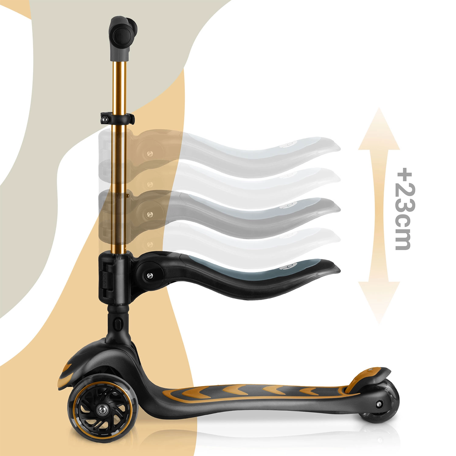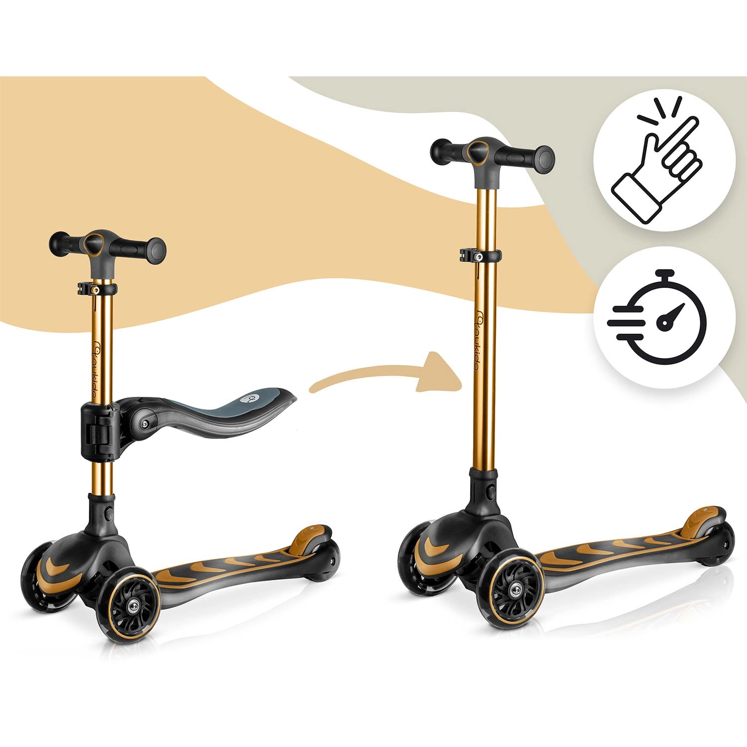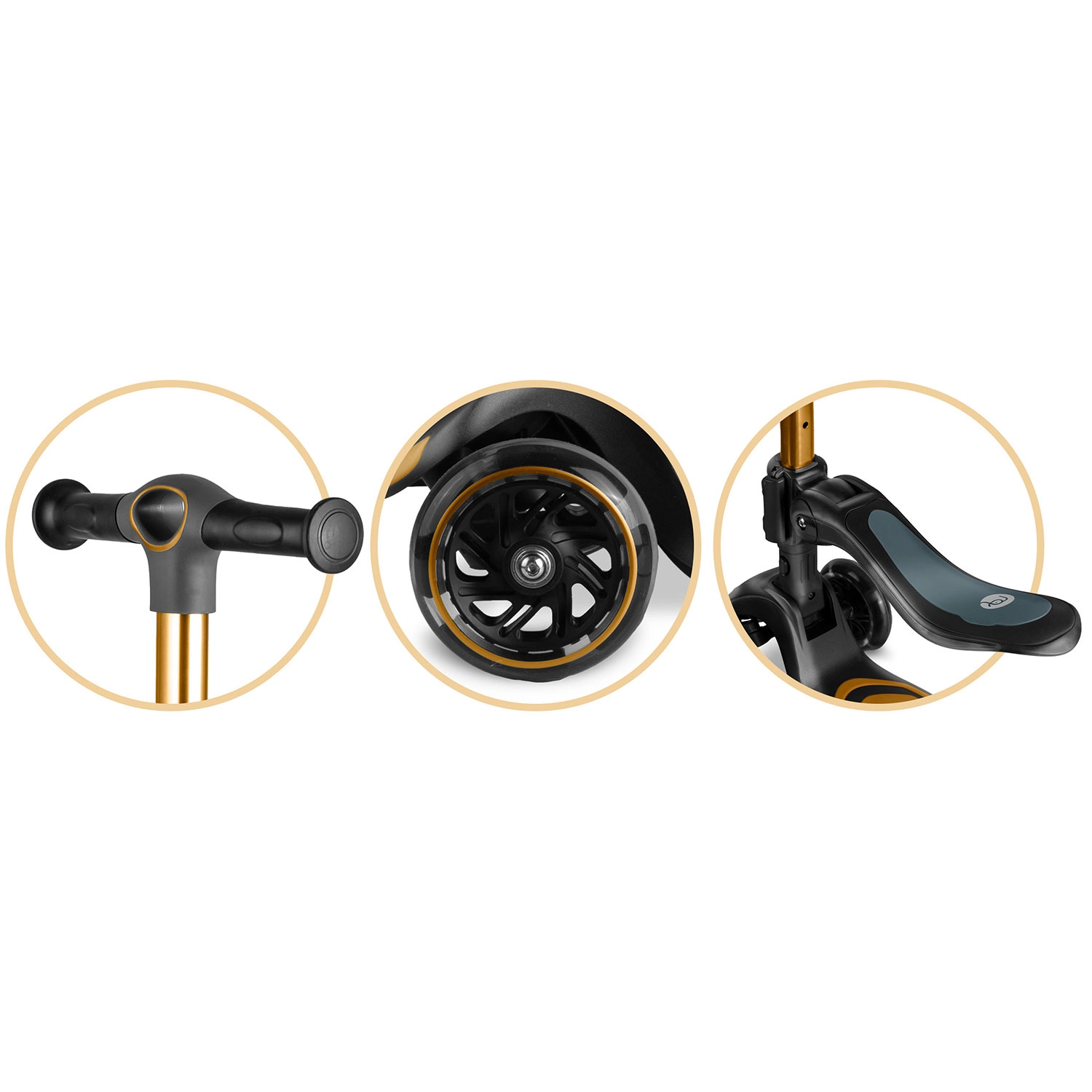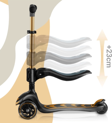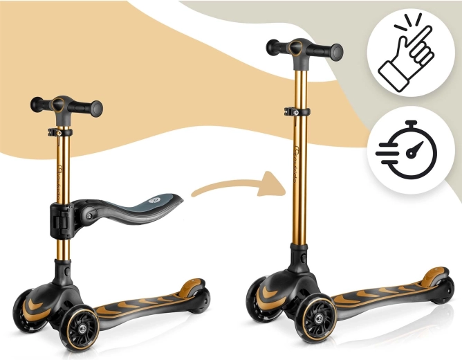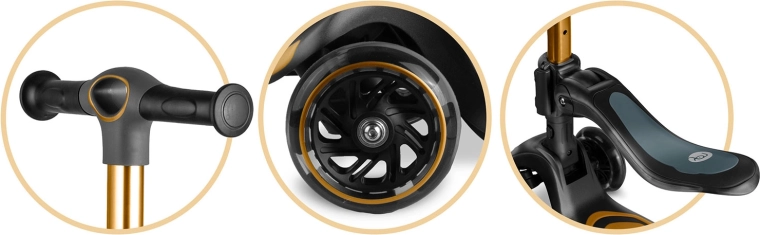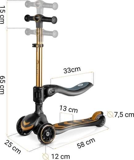 T-bar z regulacją wysokości oraz odpinane siedzisko z 3-stopniową regulacją umożliwiają przejście od jeździka do hulajnogi. Jedna zabawka na wiele lat radości.