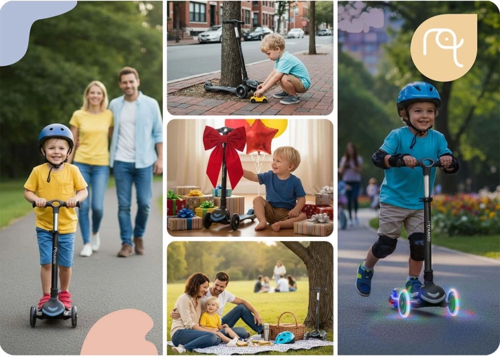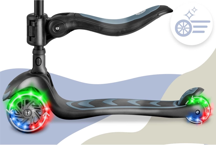 Praktyczne detale, takie jak oświetlenie LED kółek (dynamo bez baterii), szeroki antypoślizgowy podest oraz mocny hamulec nożny, zwiększają komfort i bezpieczeństwo jazdy. Regulowana wysokość kierownicy i siedziska pozwala hulajnodze rosnąć wraz z dzieckiem, lekka aluminiowa kierownica ułatwia prowadzenie, a wytrzymała konstrukcja gwarantuje długotrwałe użytkowanie.