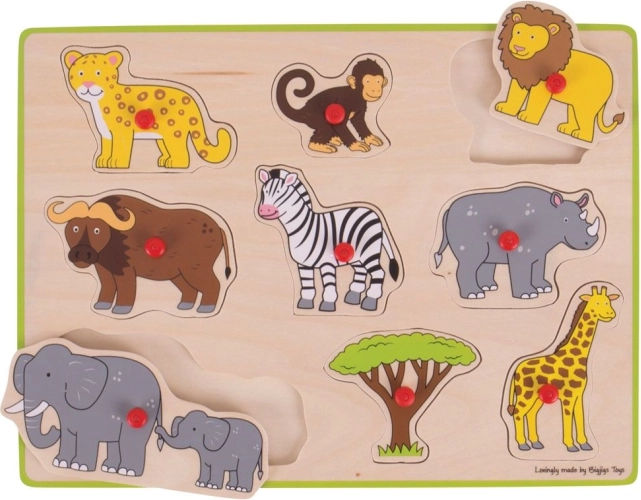 Drewniana układanka Safari to idealna zabawka edukacyjna dla dzieci, które chcą nauczyć się rozpoznawania kształtów i zwierząt. Dzięki praktycznym czerwonym uchwytom dzieci mogą łatwo manipulować każdym kolorowym elementem.