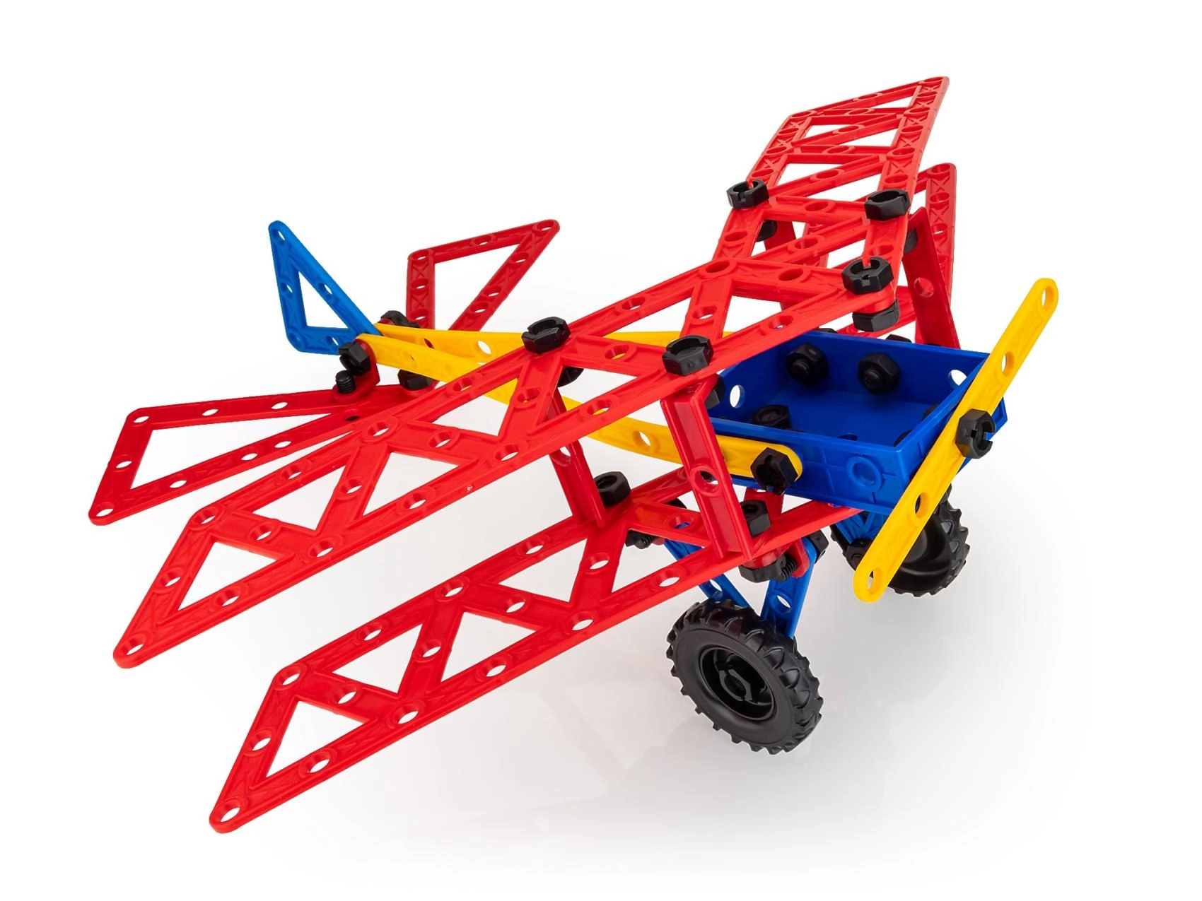 Duże perforowane panele, belki i łączniki pozwalają zbudować szereg modeli od samolotu po statek – wyobraźnia nie zna granic.