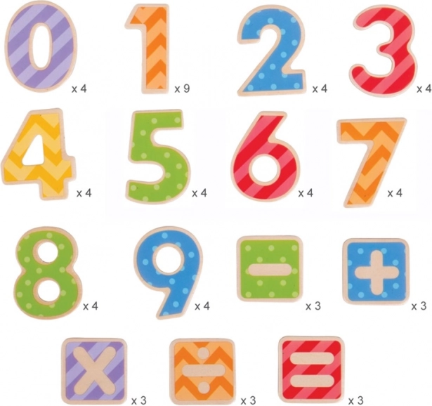 Zestaw zawiera łącznie 56 magnetycznych elementów, w tym cyfry oraz symbole matematyczne.