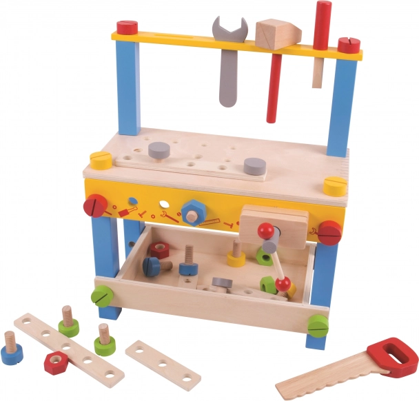 Odkryj pierwszy warsztat dla małych majsterkowiczów – solidny drewniany stół z 26 elementami, który wspiera małą motorykę, koordynację ręka–oko oraz kreatywną zabawę. W zestawie dziecięce narzędzia: młotek, piła, klucz, śrubokręt, śruby i nakrętki. Wykonany z wysokiej jakości drewna, spełnia europejskie normy bezpieczeństwa.
