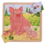 Pierwszy wspólny spacer świnki z prosiaczkiem na uroczym obrazku przyciąga uwagę dzieci od pierwszego spojrzenia. Puzzle z 16 elementami umieszczone są w ramie z podkładowym motywem, dzięki czemu początkujący mali układacze szybko się orientują i cieszą się radością z sukcesu. Elementy są wystarczająco duże i przyjemne w dziecięcej dłoni.