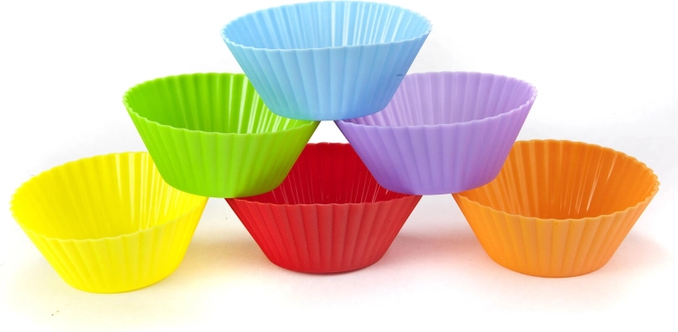 Praktyczne silikonowe foremki CULINARIA o wymiarach 7,5 × 3 cm w zestawie 6 sztuk do łatwego i wielokrotnego pieczenia muffinów i cupcake’ów. Dzięki wysokiej jakości silikonowi są odporne na temperatury do 230 °C, nieprzywierają i gotec wypieki można łatwo wyjąć. Kolorowy mix (żółty, pomarańczowy, różowy, fioletowy, niebieski, zielony) doda pieczeniu radosnego stylu, a mycie w zmywarce oszczędza czas.