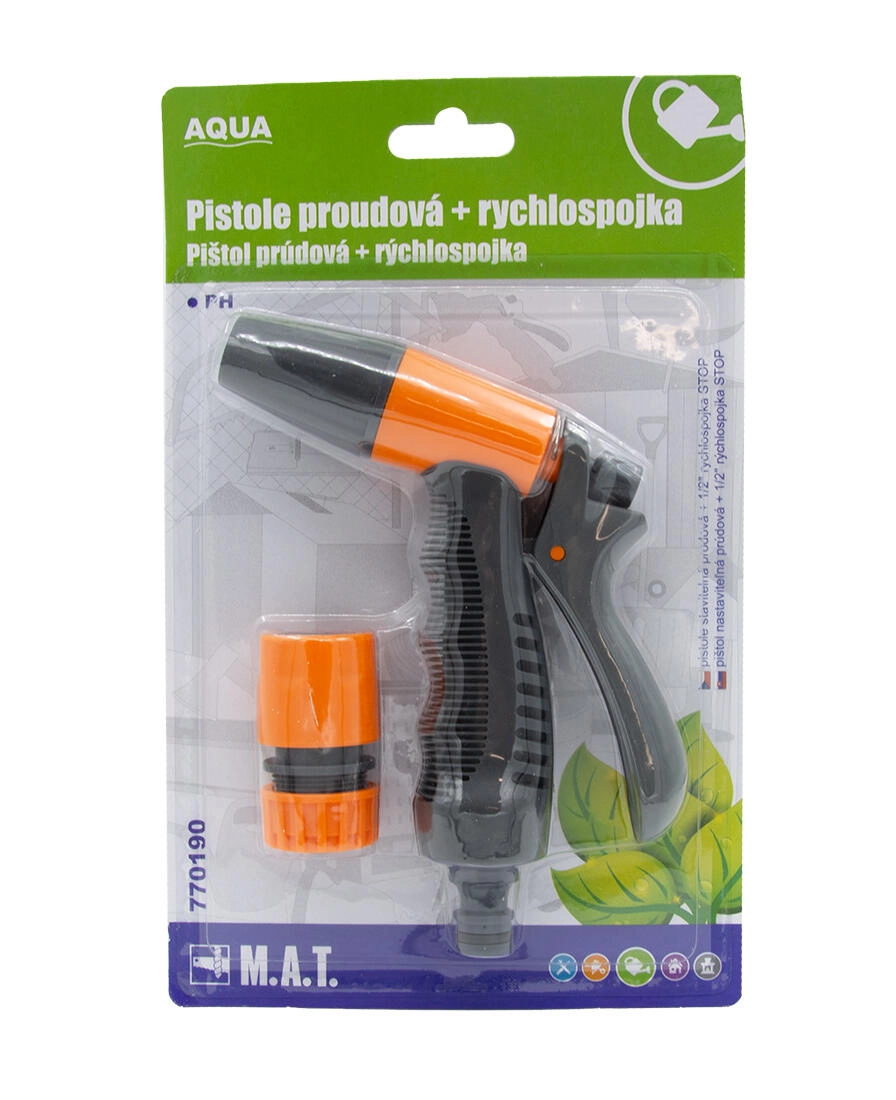 Praktyczny zestaw do węży ogrodowych zawiera regulowaną pistoletową dyszę oraz szybkozłączkę STOP 1/2" do natychmiastowego zatrzymania przepływu wody po odłączeniu. Idealny do wygodnego podlewania, spłukiwania i pielęgnacji ogrodu z prostą obsługą i niezawodną, wytrzymałą konstrukcją z tworzywa.